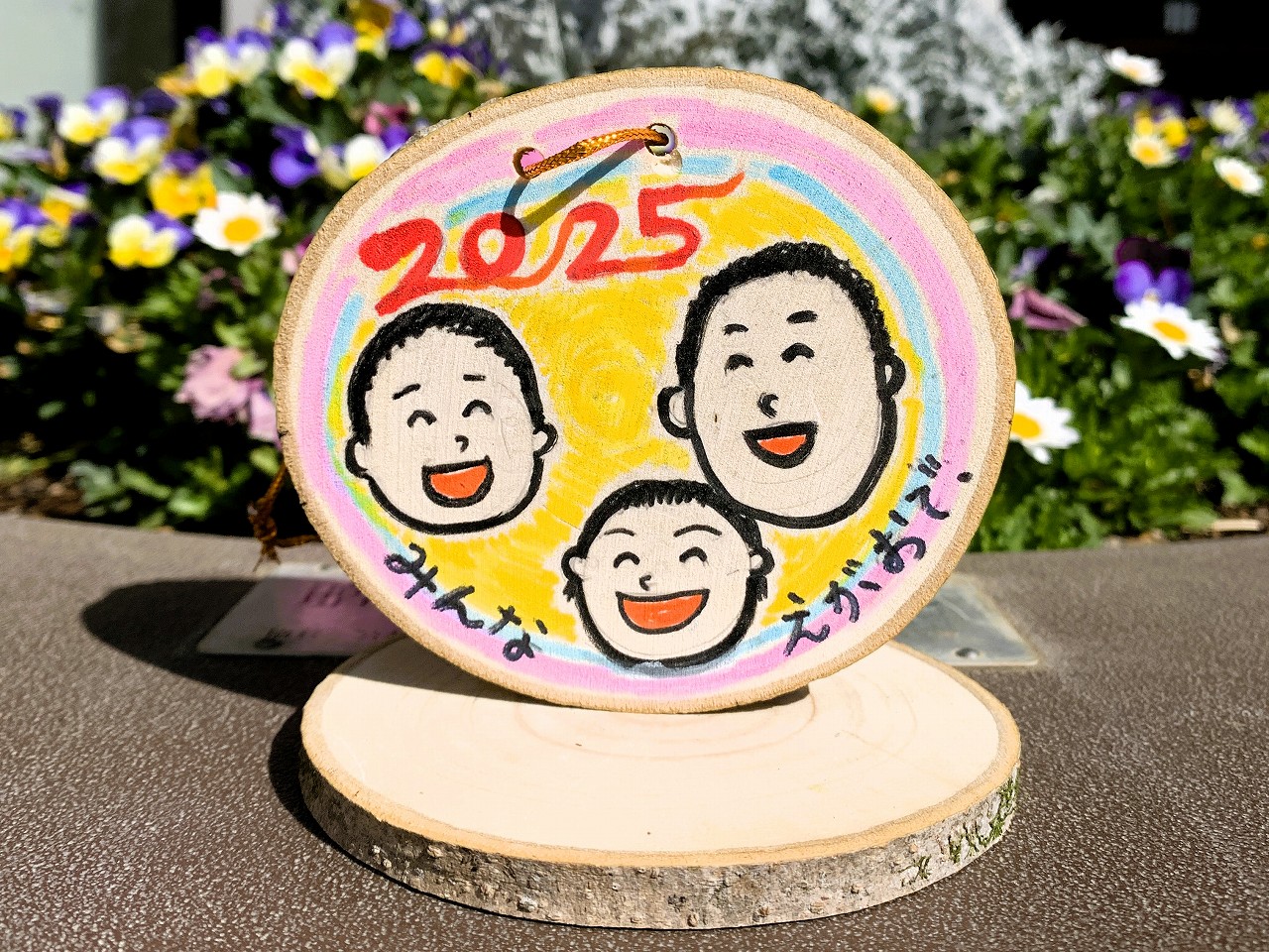 園内の間伐材を輪切りにし1年の豊富や絵を書いて絵馬を作ります。