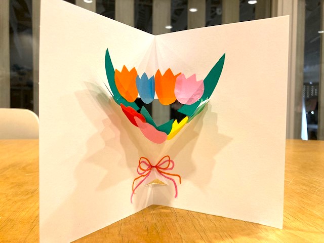 折り紙で切り抜いた春のお花を台紙に貼って、飛び出すしかけカードを作ります!