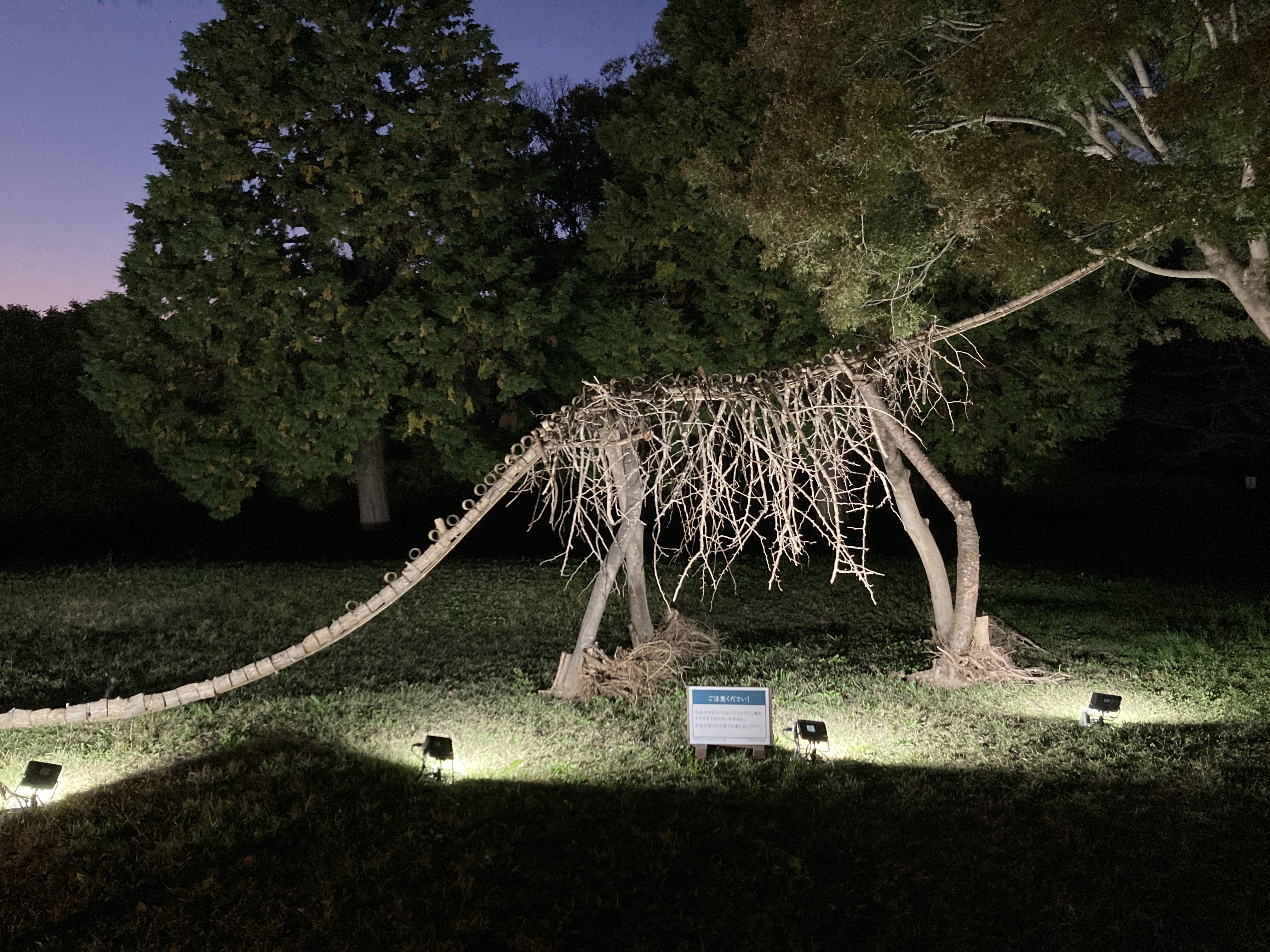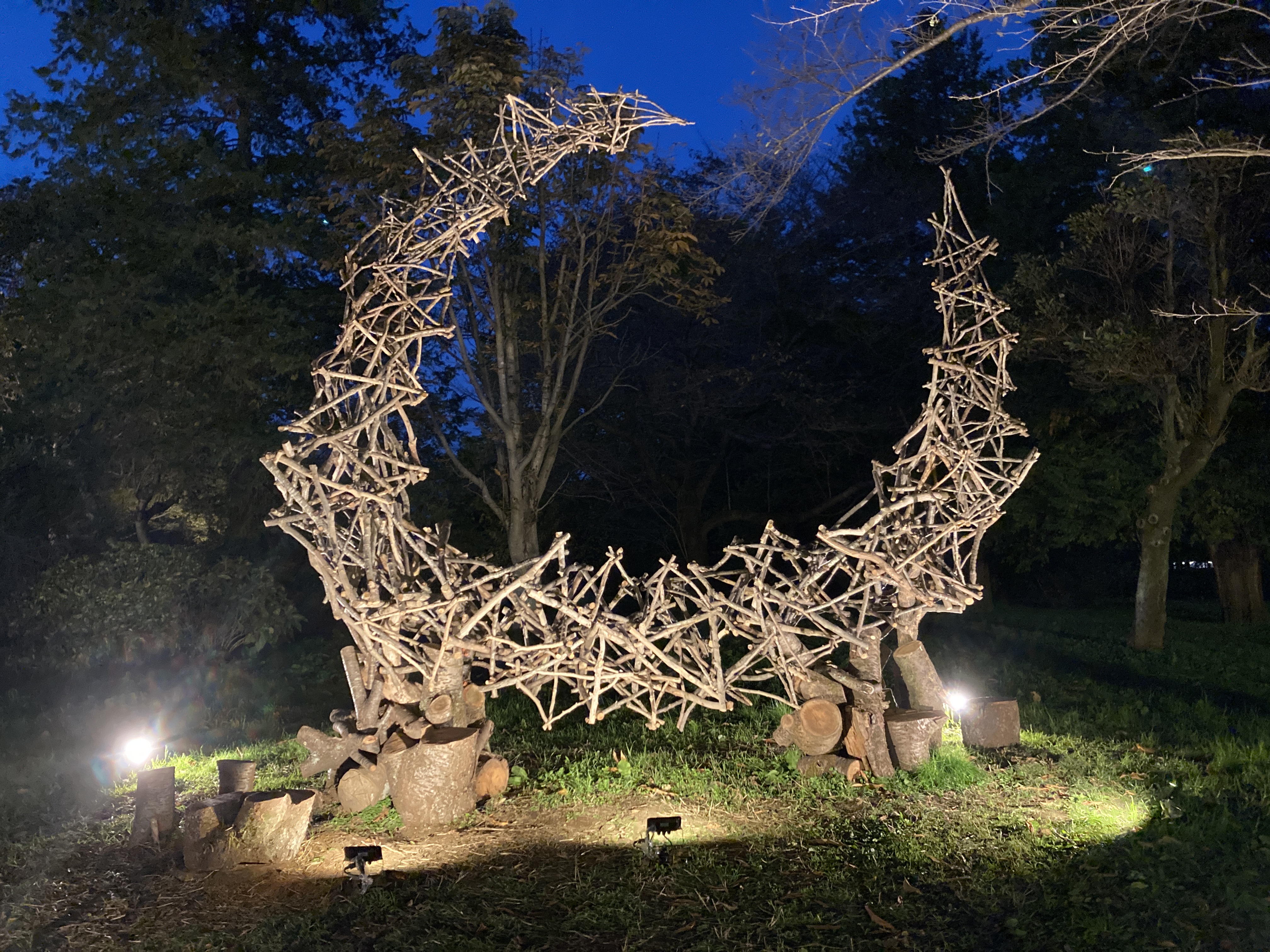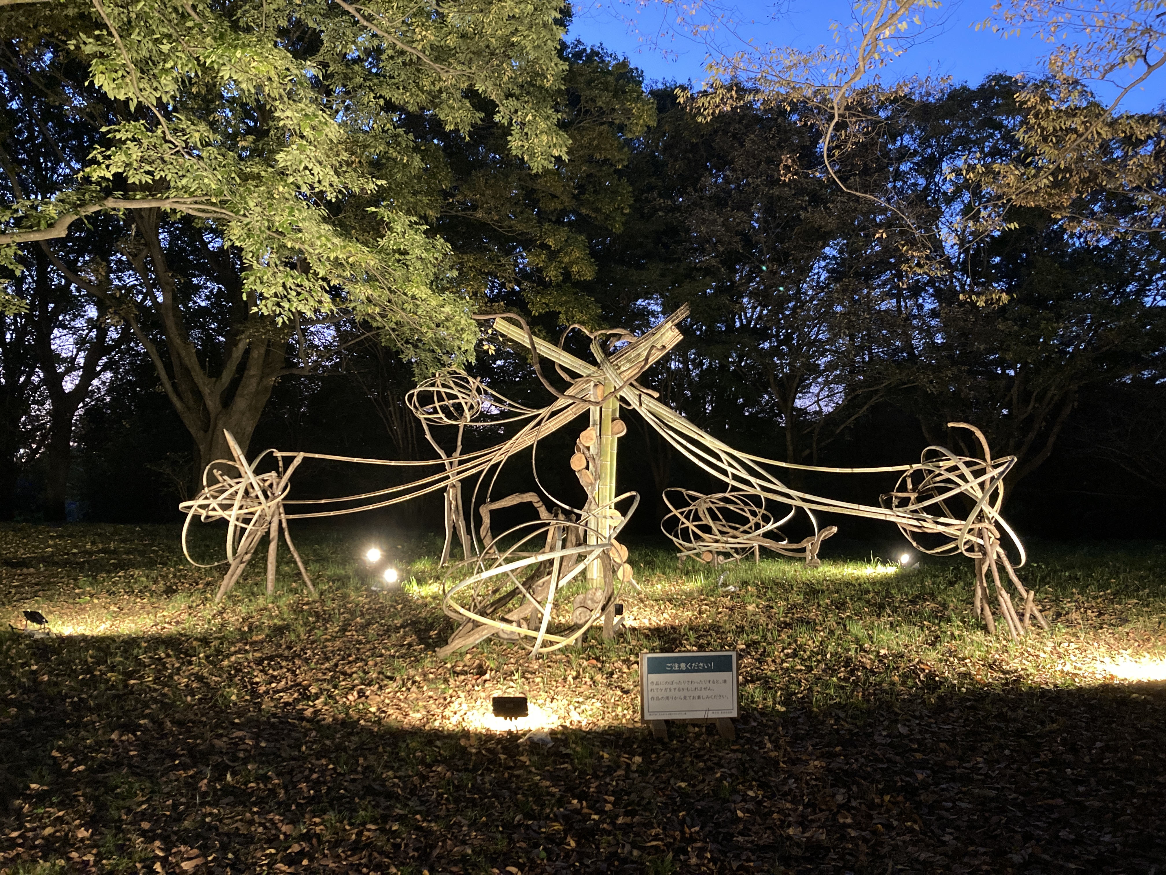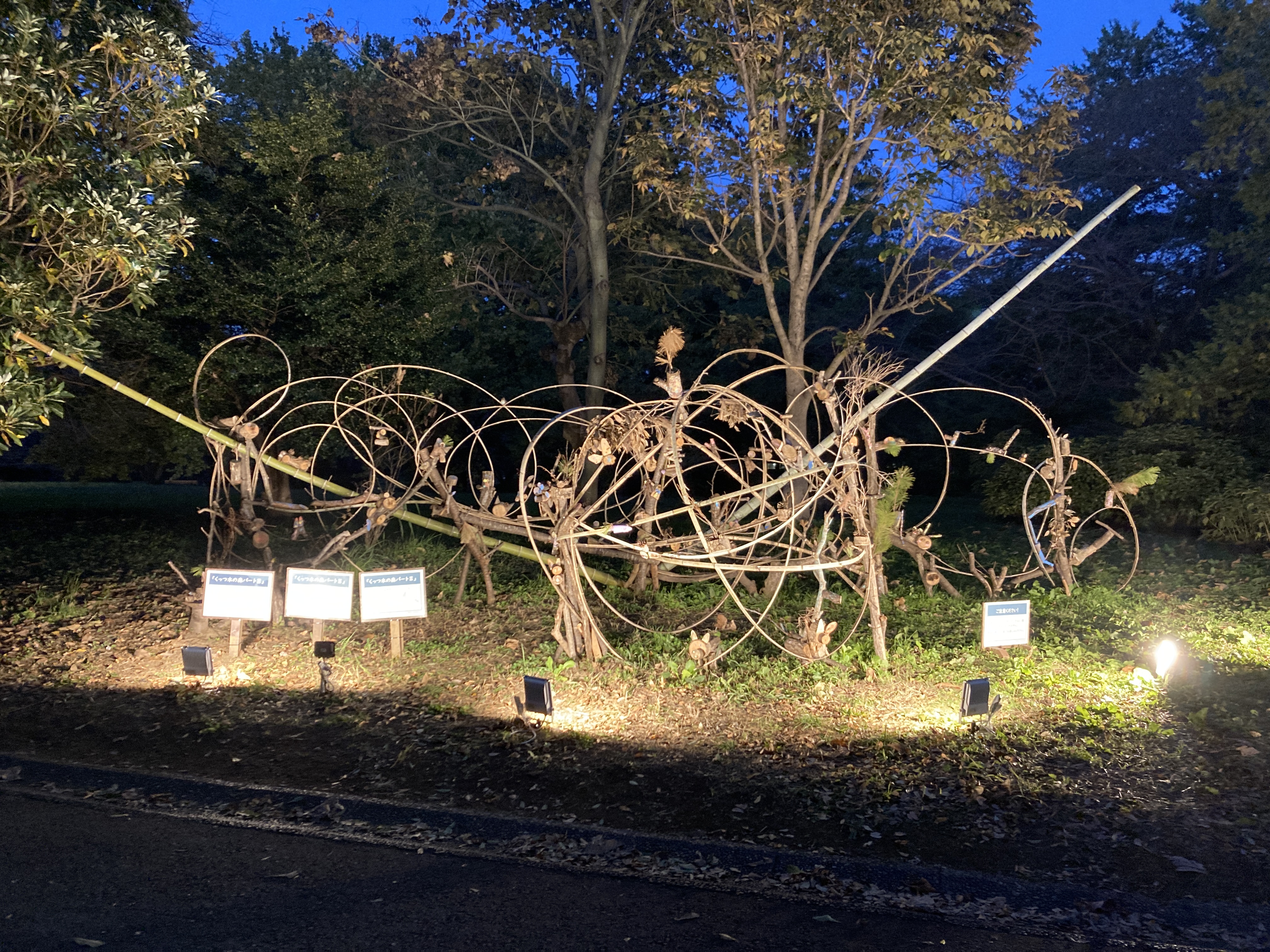 昭和記念公園内の剪定された樹木などを、いけばな草月流東京西支部の方々がアート作品に生まれ変わらせ、ライトアップで演出します。