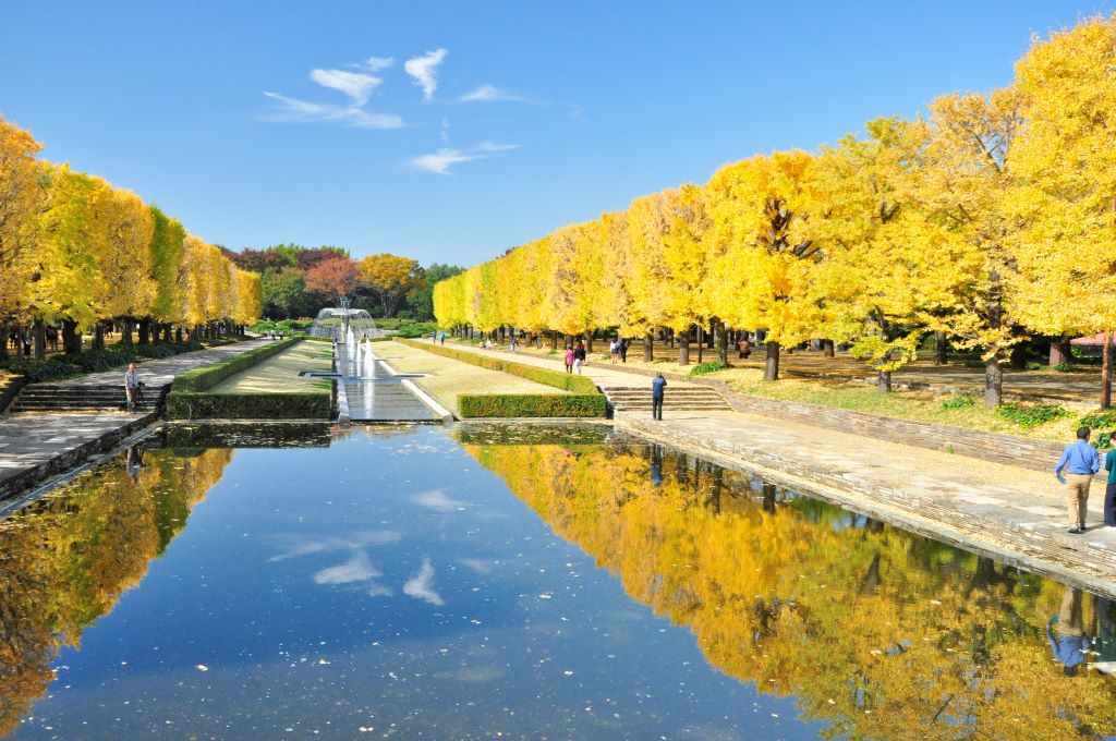 公園の玄関口に位置する紅葉スポット「カナール」。2本のイチョウ並木、中央を流れる水路、噴水、整形された幾何学的な美しさが魅力です。