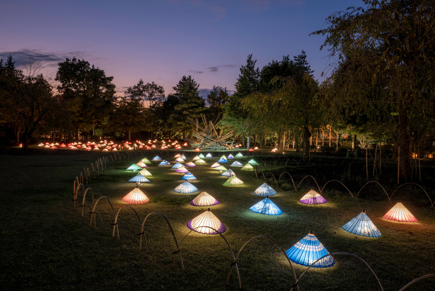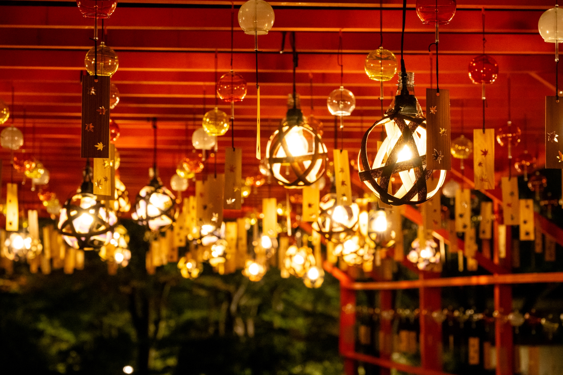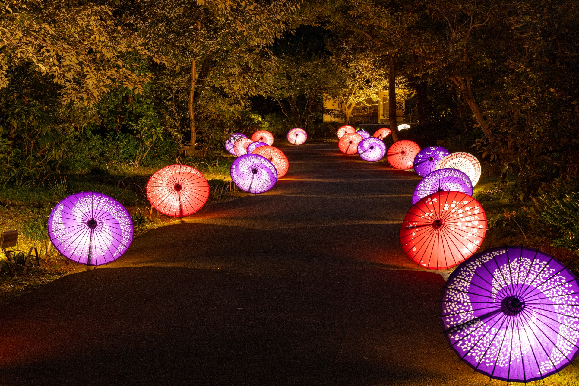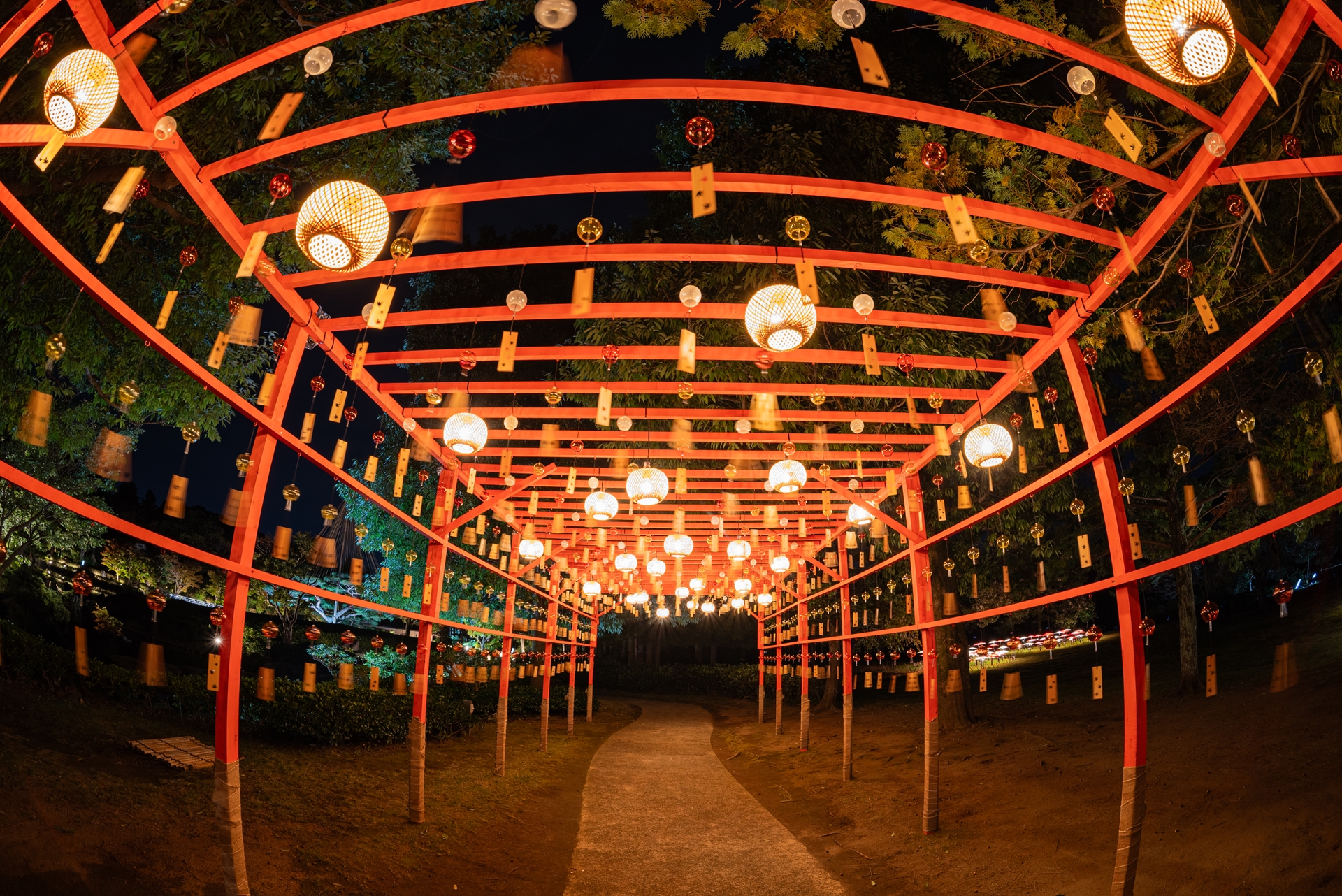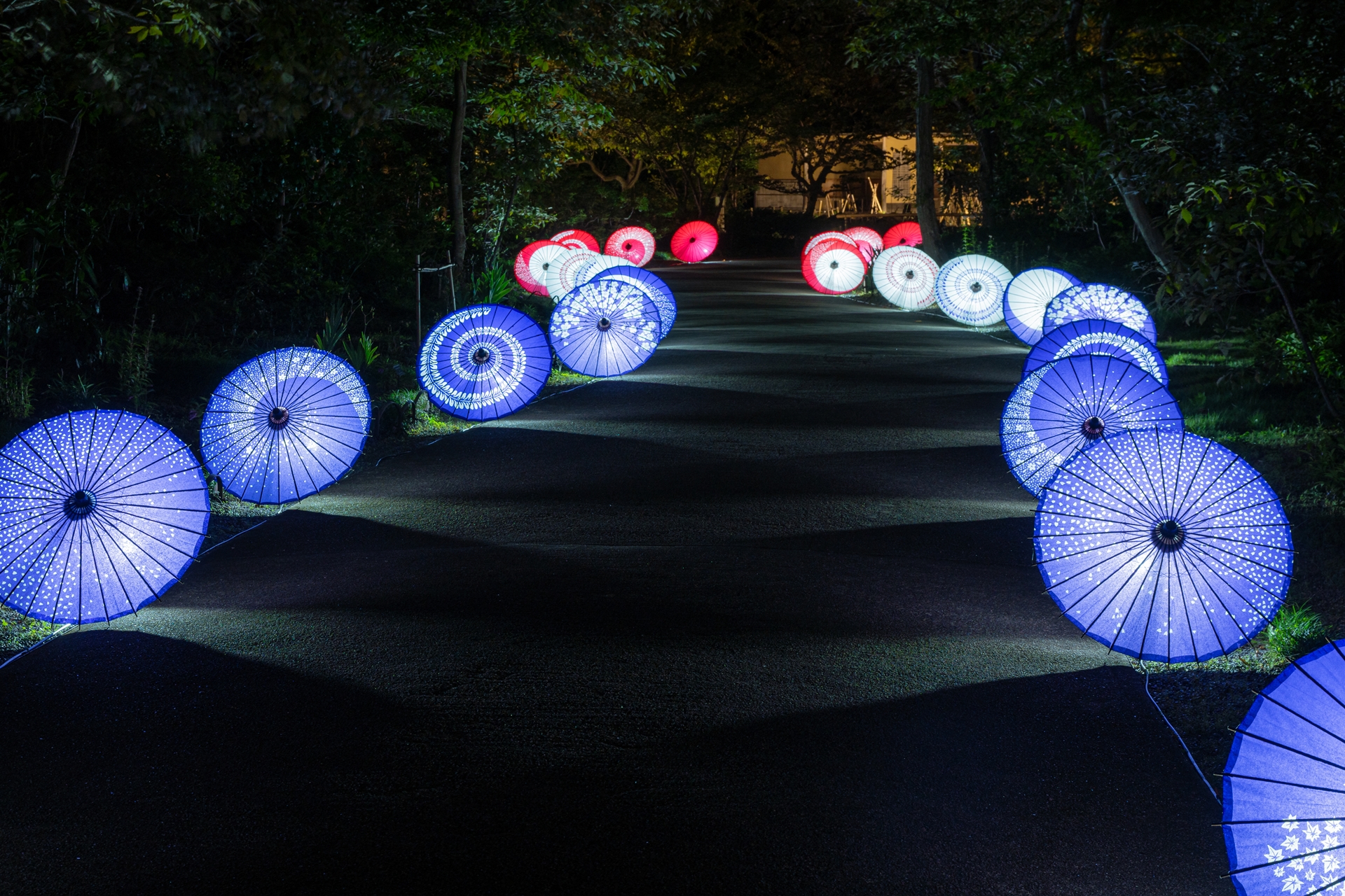 日本庭園内に和傘や風鈴を設置し、カラフルなデザインと照明が相まって、幻想的な雰囲気をお楽しみいただけます。