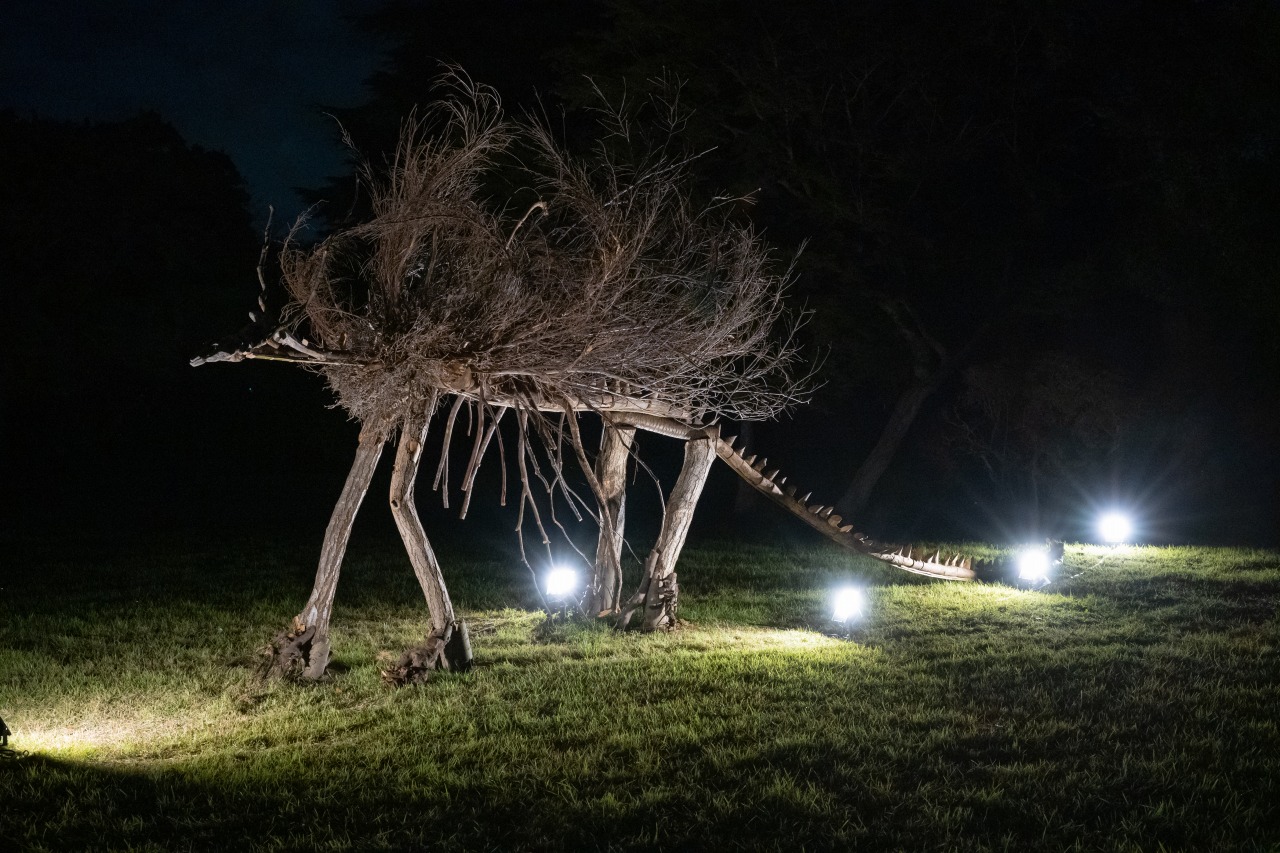 公園内で剪定された樹々や竹・台風などによる倒木を素材として、チップとして土に還される前に、もう一度造形作品としてよみがえらせたいという思いのもと、インスタレーションを展示します。