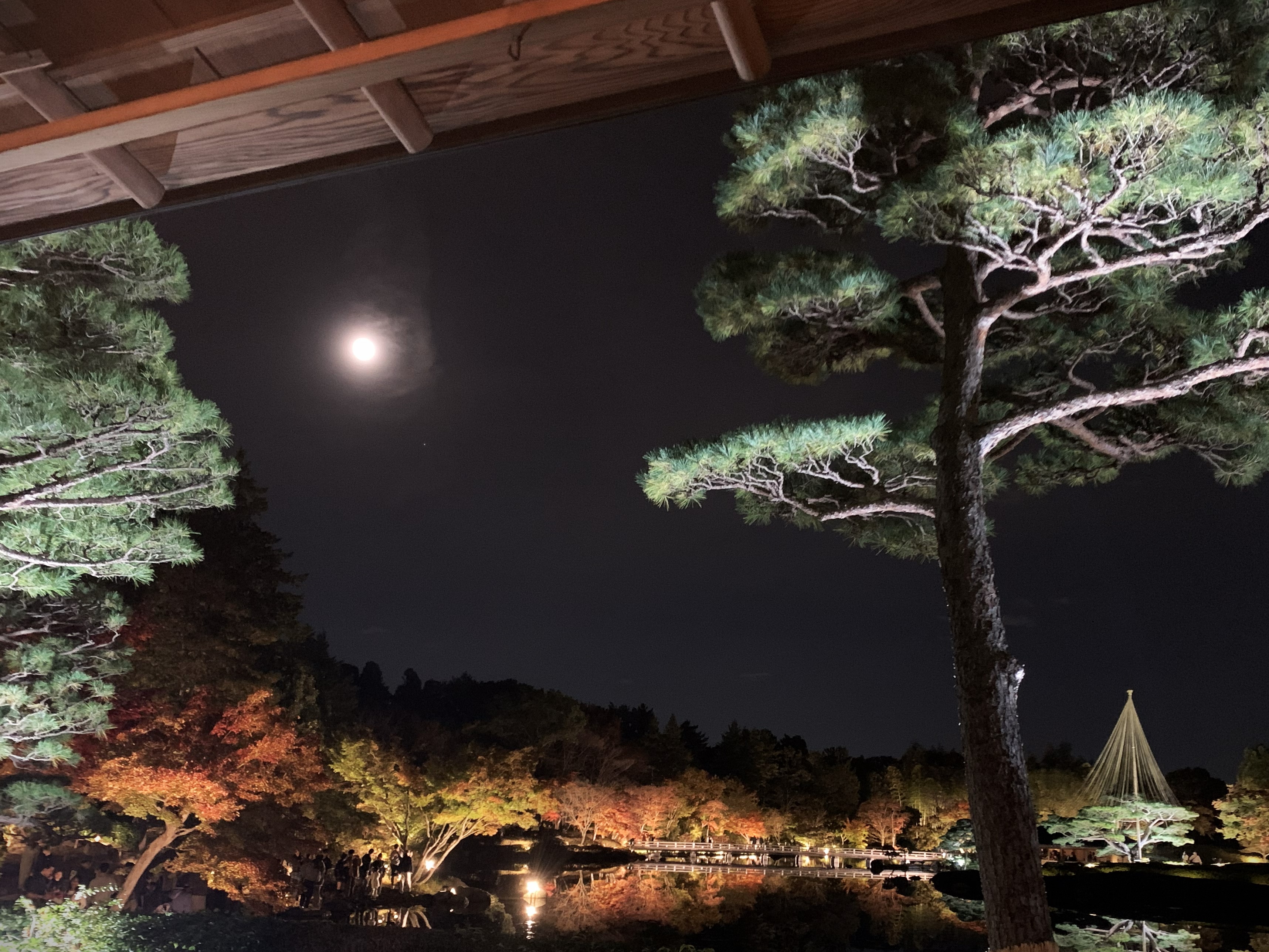 お点前終了後には、庭に出て秋の夜散歩のライトアップ、天候が良ければ月夜の日本庭園の景観を楽しむことができます。(三脚の使用はできません)