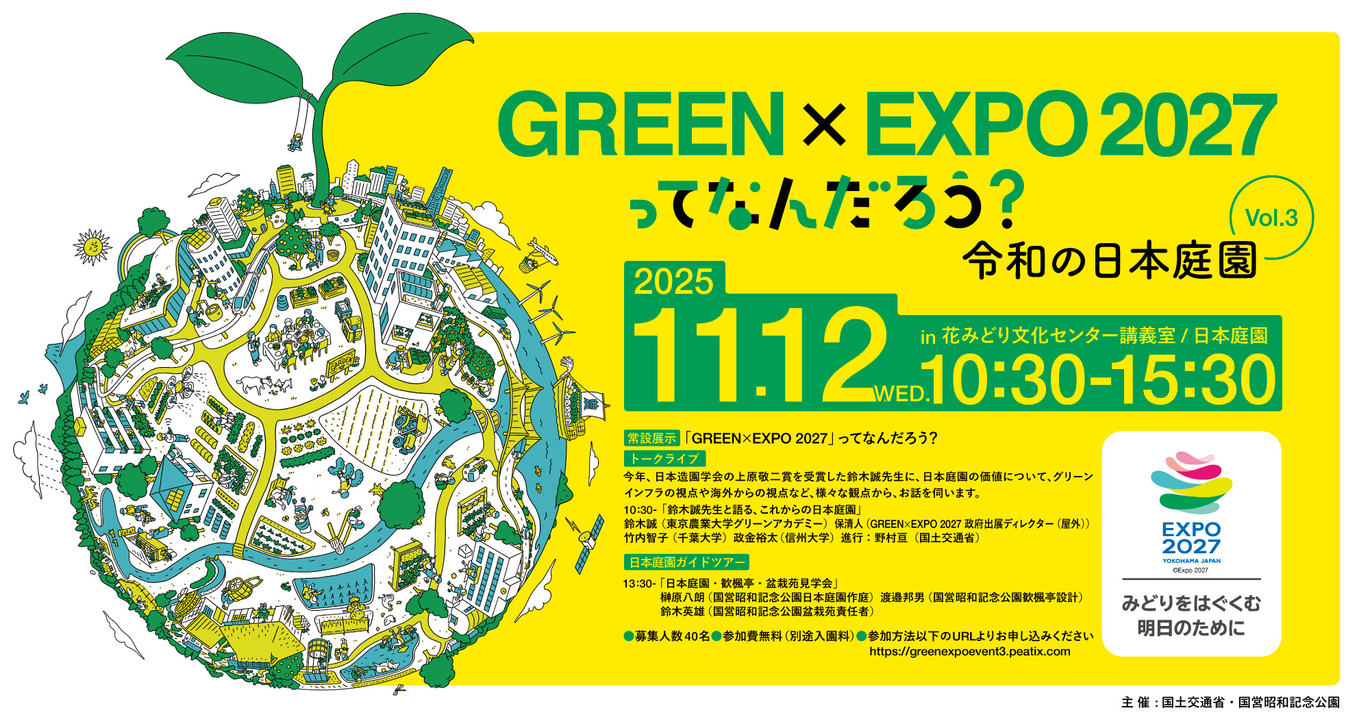 - 登壇者:鈴木誠〈東京農業大学グリーンアカデミー〉、保清人〈GREEN×EXPO 2027 政府出展ディレクター(屋外)〉、竹内智子〈千葉大学〉、政金裕太〈信州大学〉