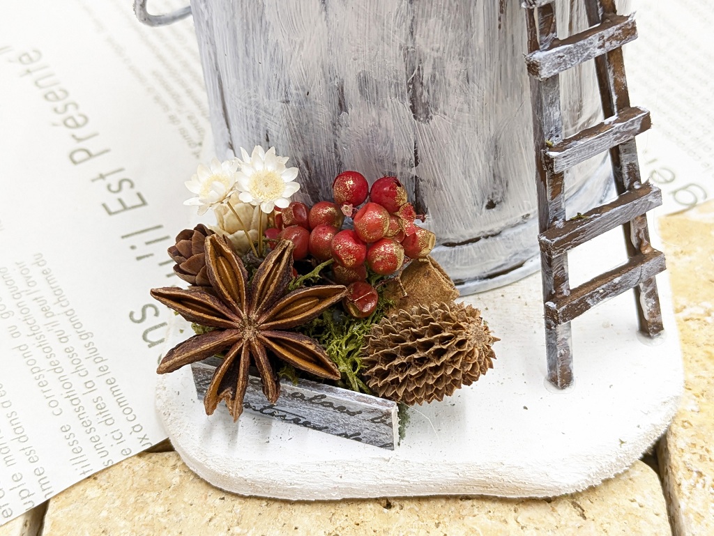 ※作品サイズは巾9㎝×奥行き20㎝×高さ22㎝(ブリキの器の大きさ直径8㎝×高さ10㎝)