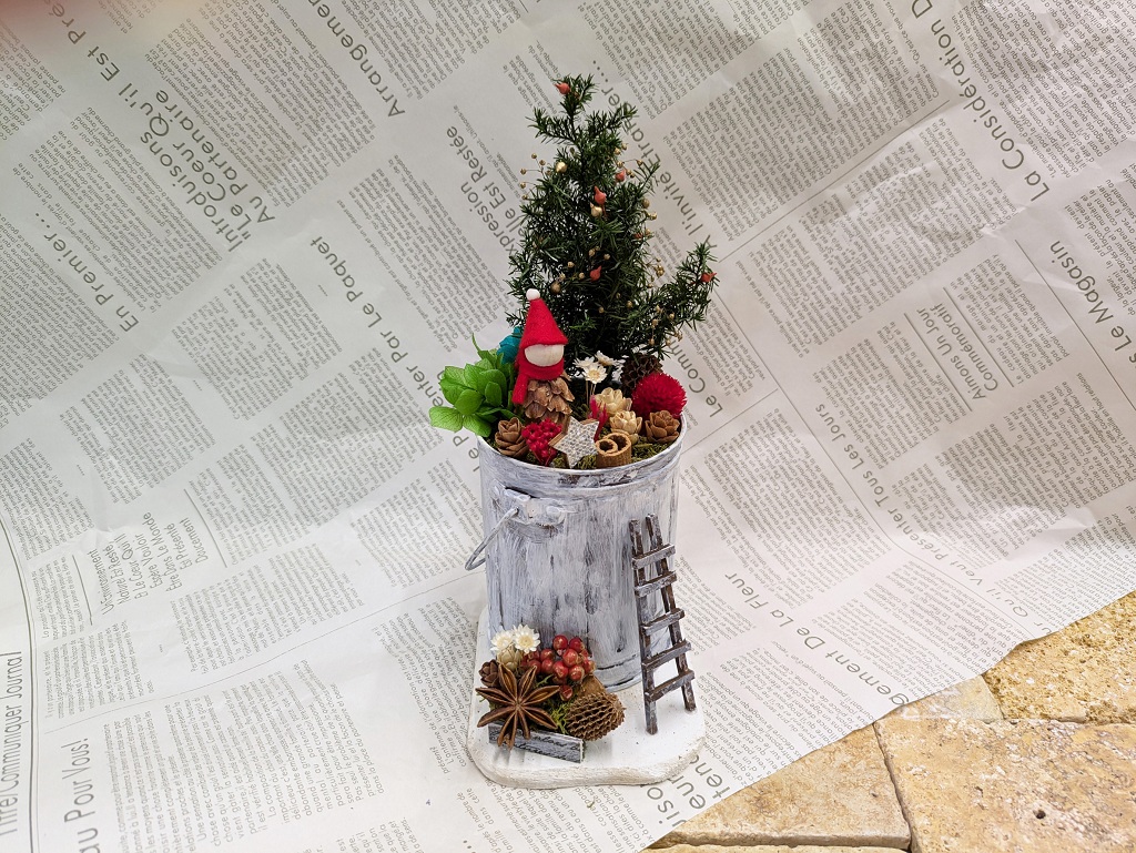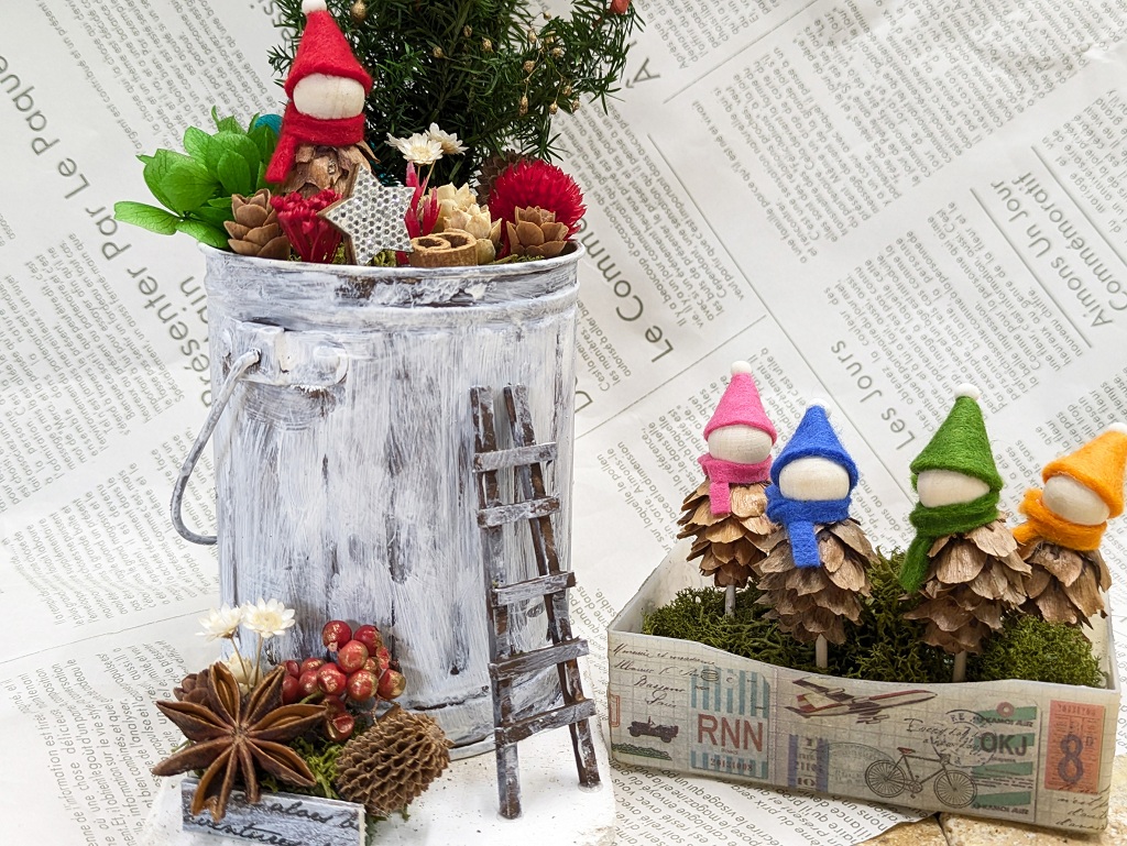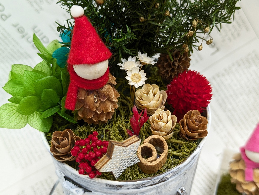 ヒムロスギやペッパーベリー、木の実、その他プリザーブド加工をしたあじさい、千日紅等を贅沢に使って箱庭アートを作ります。