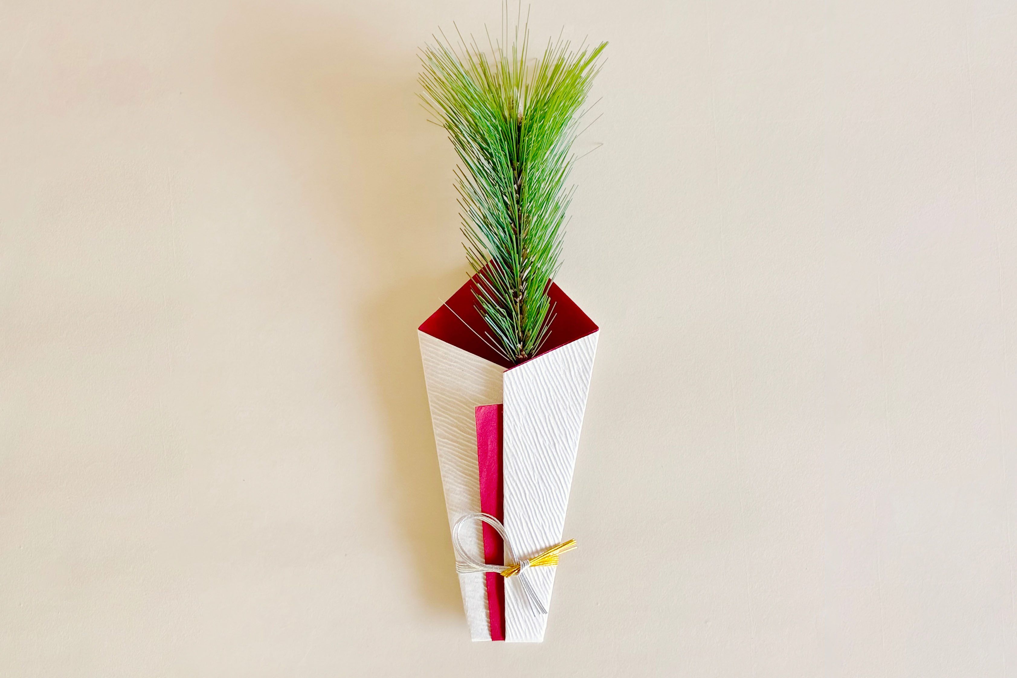 「木の花包み」といわれる折形で包み、門松の代わりに松飾りに仕立て、ドアや壁に飾れるようにします。