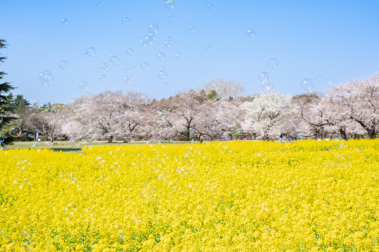 早春の花の開花に合わせて、花畑にて時間限定のシャボン玉演出を行います。
