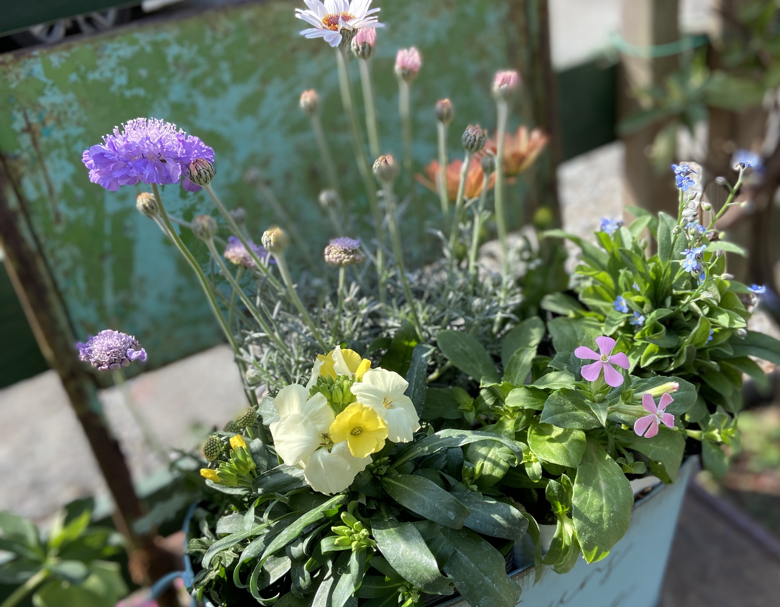 パステル調のピンクや黄色、ブルーのお花でビタミンカラーの寄せ植えを作ります。