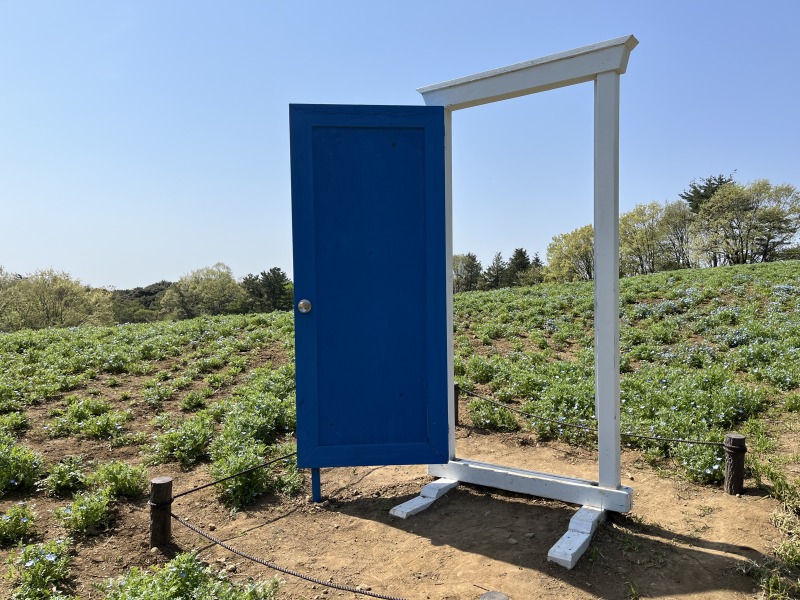 ポピーとカスミソウの花畑に、白いドアを設置します。