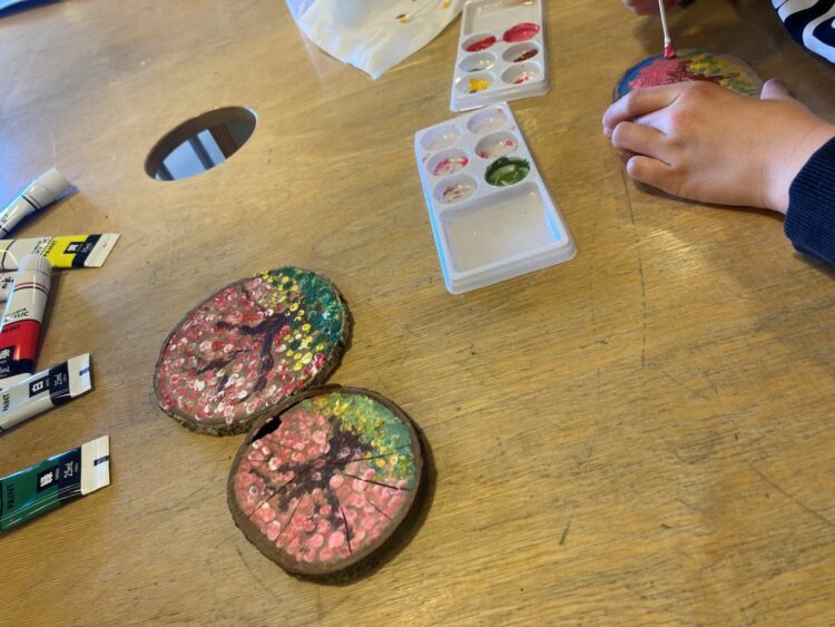くにたち桜守の大谷氏指導のもと、桜の剪定枝に絵を描きコースターを作ります。