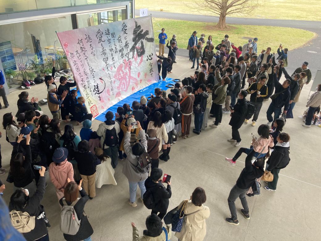 都立国立高校の書道同好会の皆さんが、巨大な紙の上に乗り、