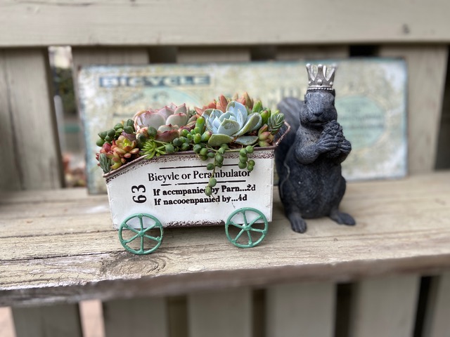 アンティーク調のカート型のブリキ鉢に多肉植物とセダムを寄せ植えします。