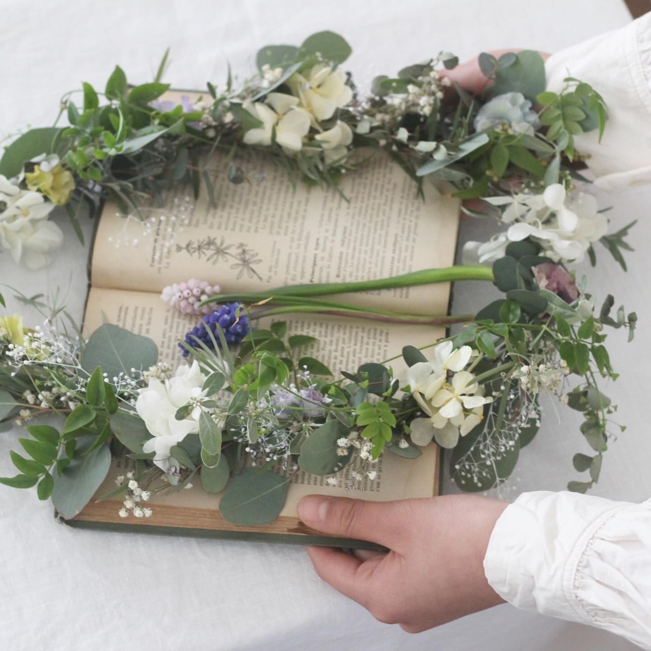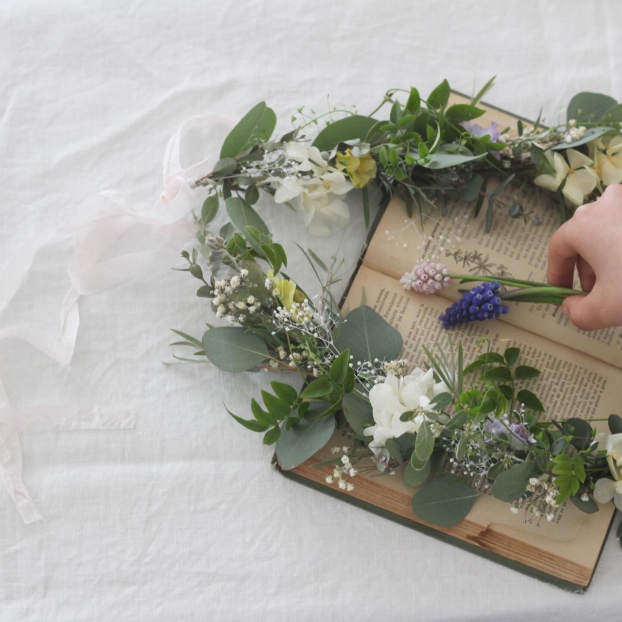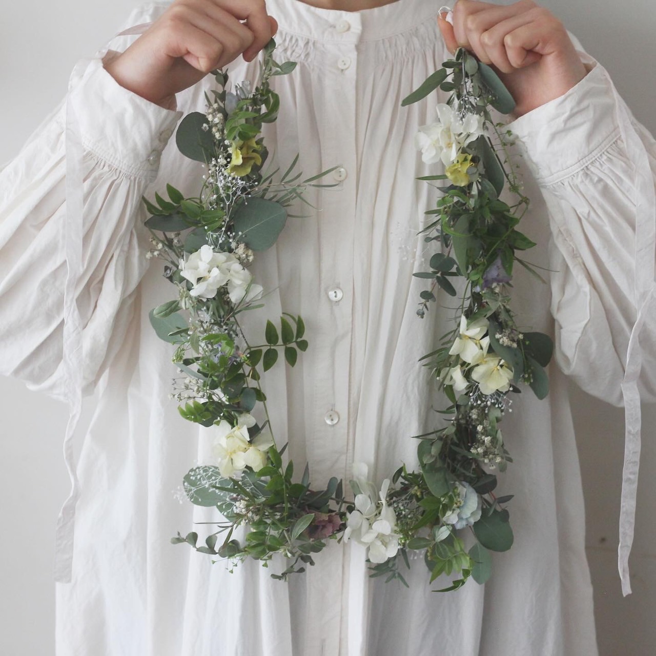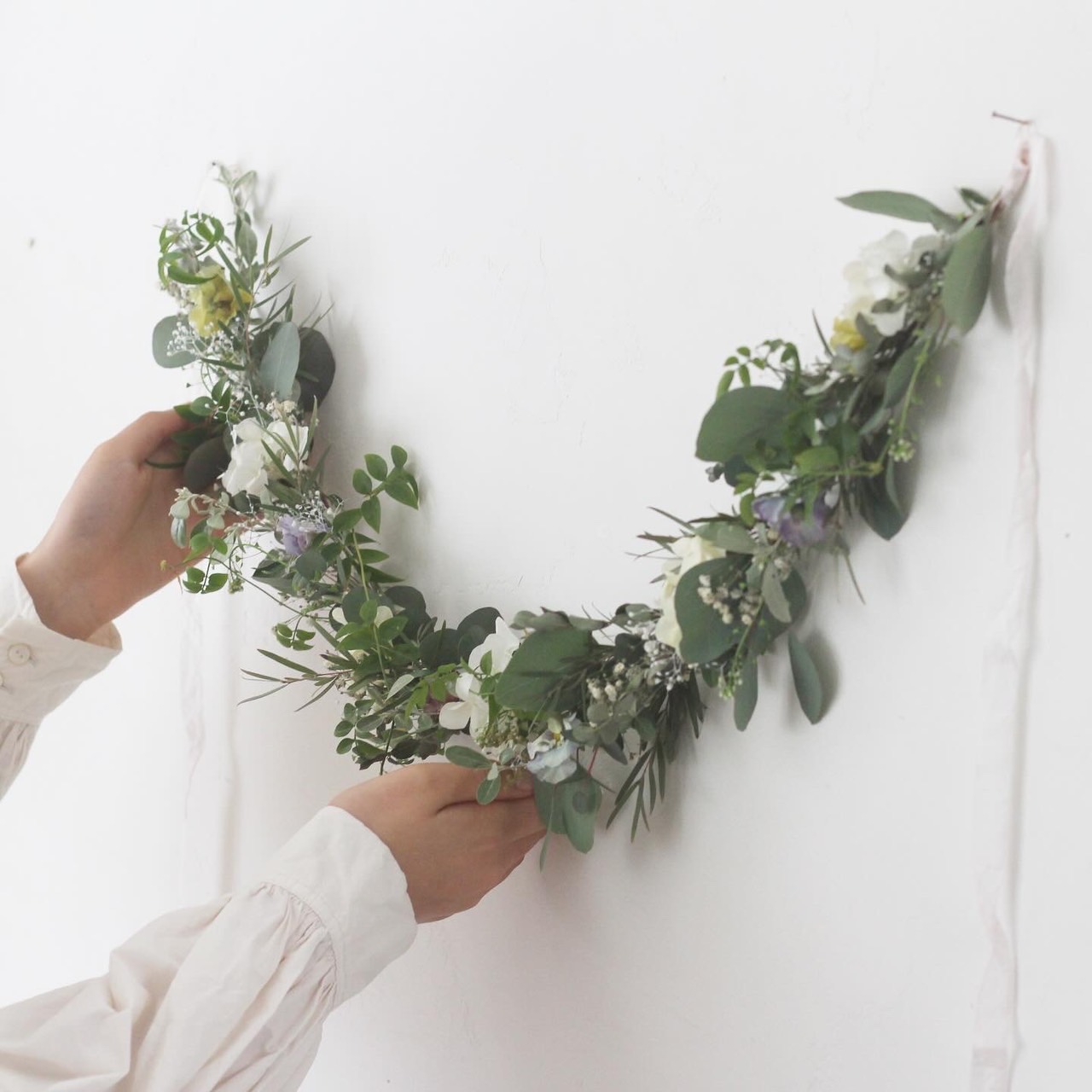 芽吹きだしたばかりのロシアンオリーブや、元気に咲きだしたなずなやビオラなどやわらかなグリーンと一緒に束ねた春のガーランドを作ります。 両サイドのリボンを結んでリースのようにも飾れます。