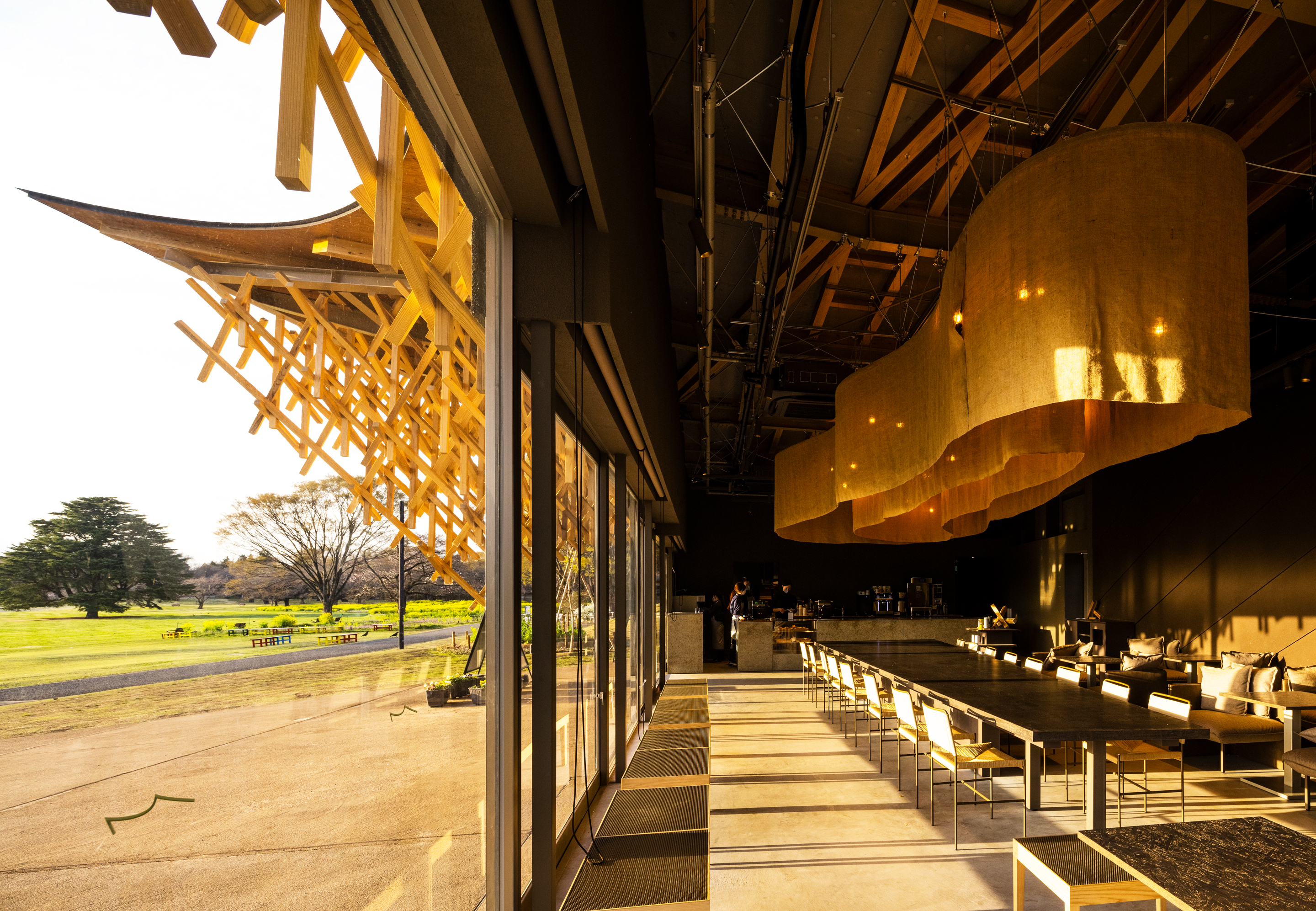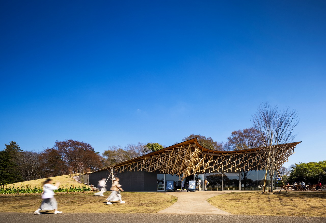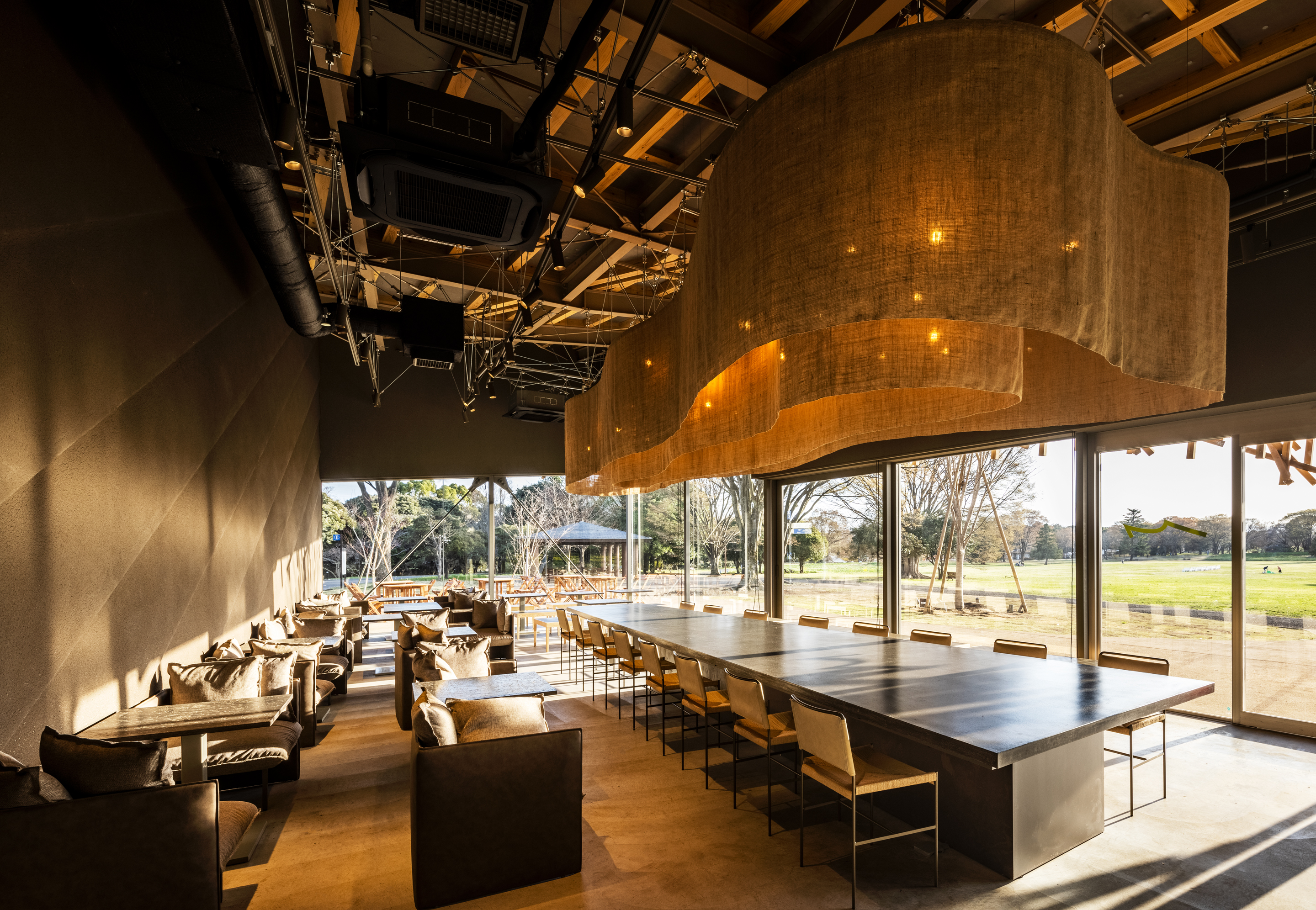 公園を象徴する「みんなの原っぱ」の東側、原っぱを見渡せる素晴らしい視点場空間に新しいカフェが2022年12月にオープンしました。緑豊かな環境に溶け込む大地のキャノピー、あたたかみを感じさせる木組みの建物が特徴です。風景と建物そして食が一体となり醸すプレミアムなパークライフ、公園の新しいカタチの誕生です。
