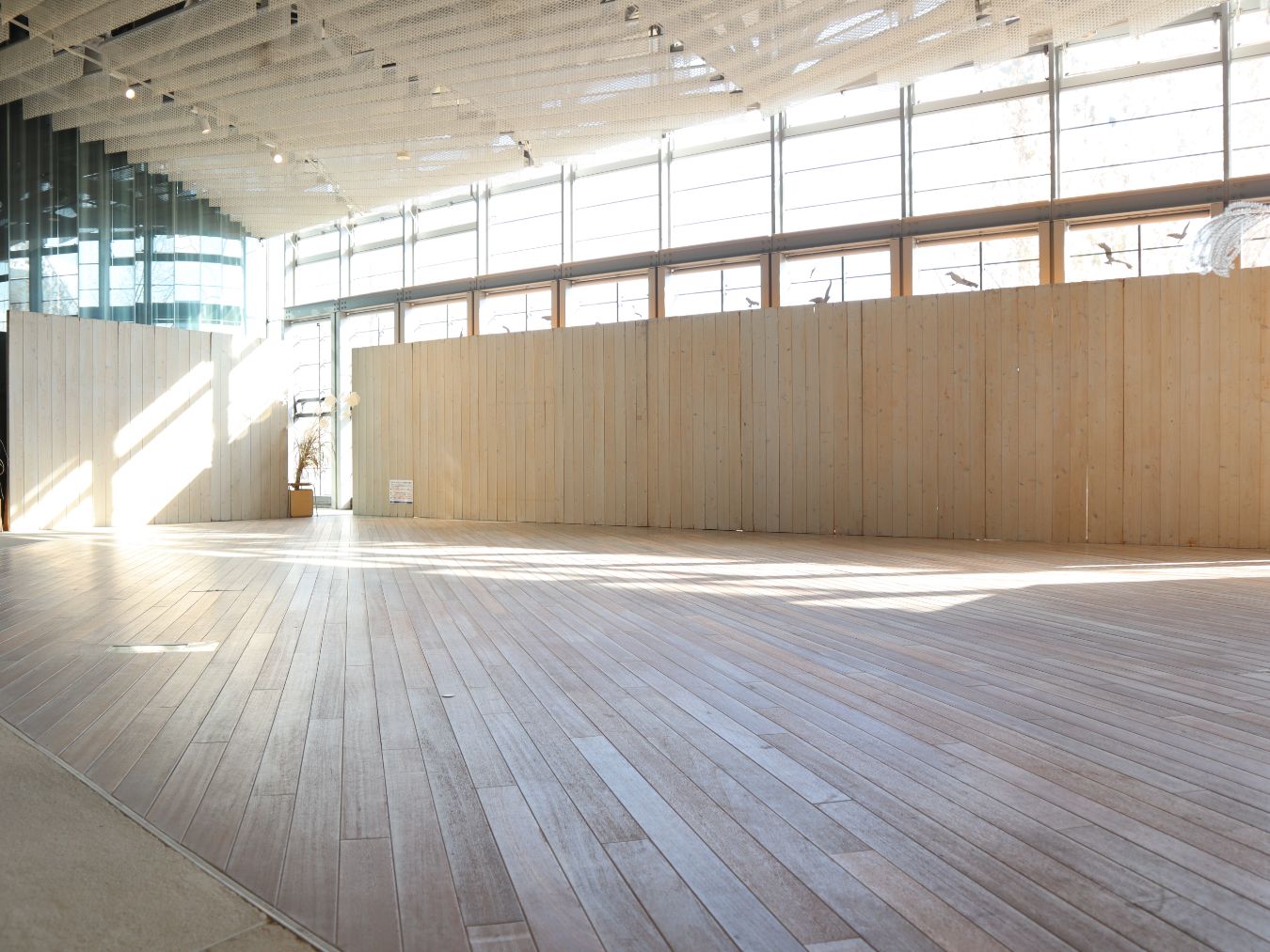 花みどり文化センターの緑化された屋上「浮游(ふゆう)の庭」は、大地の表層がそのまま浮き上がったかのような空間となっています。南側のそよぎの丘からつながる緑の丘となって、ゆめひろばを囲み、散策や休憩利用のほか、市街地の眺望を楽しむことができます。 屋根を支えるシリンダーの上に、公園内から移植した大木を植栽するなどして季節感を演出しています。面積は5,278㎡あり、建築や構造物の上にある立体的な公園の先駆けになるものと考えています。