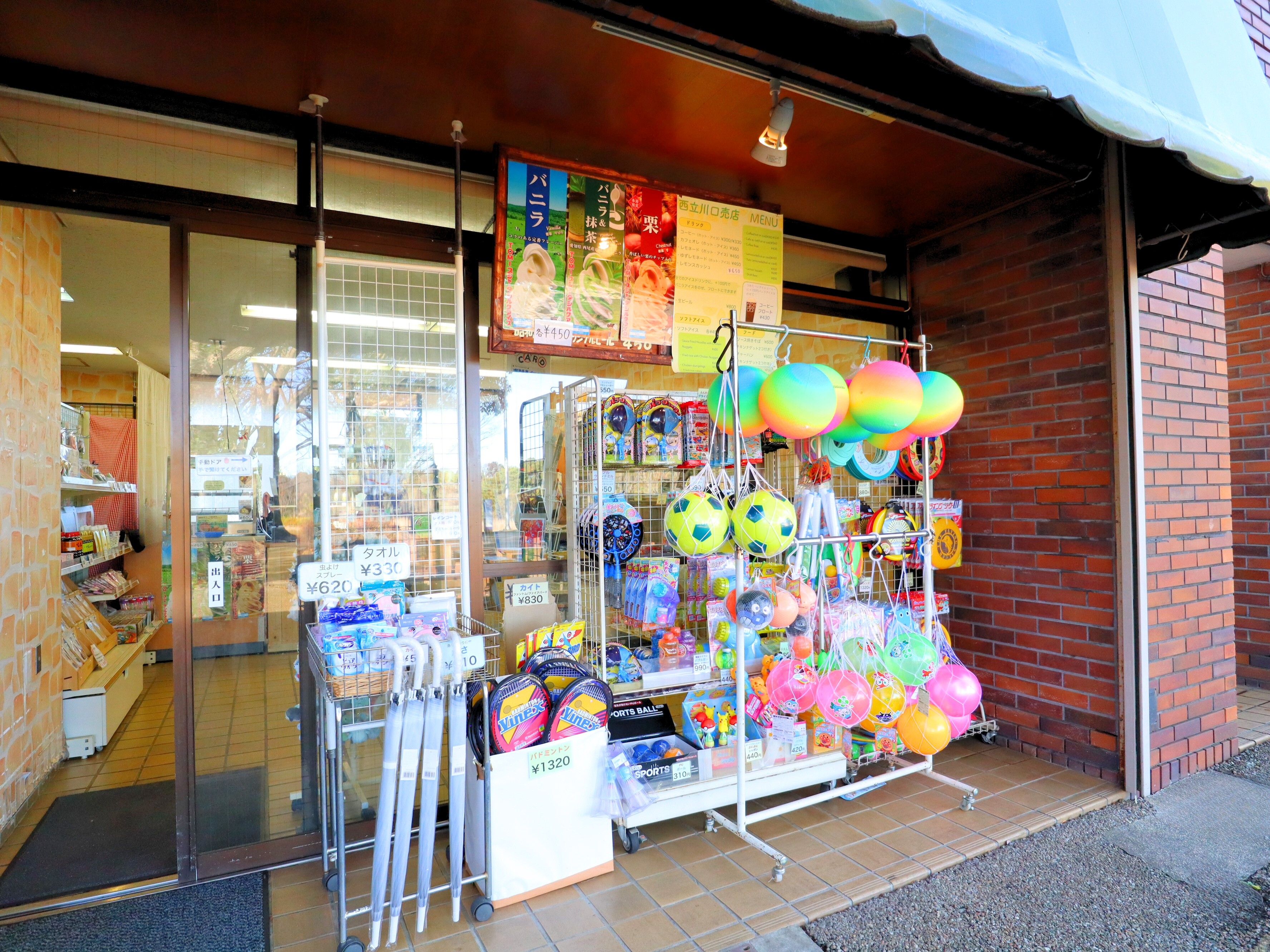 西立川ゲートに入ってすぐの売店です。ドリンクなどの軽飲食のほか、おもちゃなども販売しています。立川ならではのグッズや公園オリジナル商品をご用意しています。
