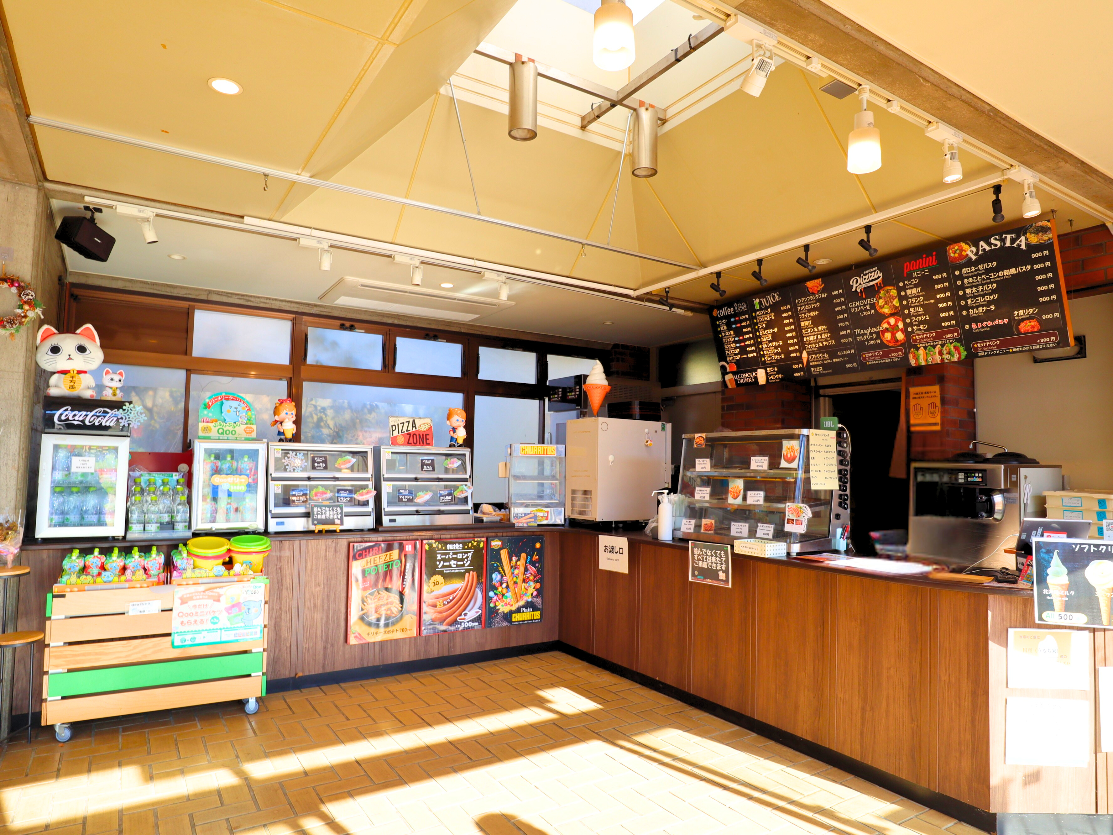 パニーニ、パスタやピザといった軽食や、挽きたてのコーヒー、北海道ソフトクリームなど、お食事にも休憩にもお使いいただけます。