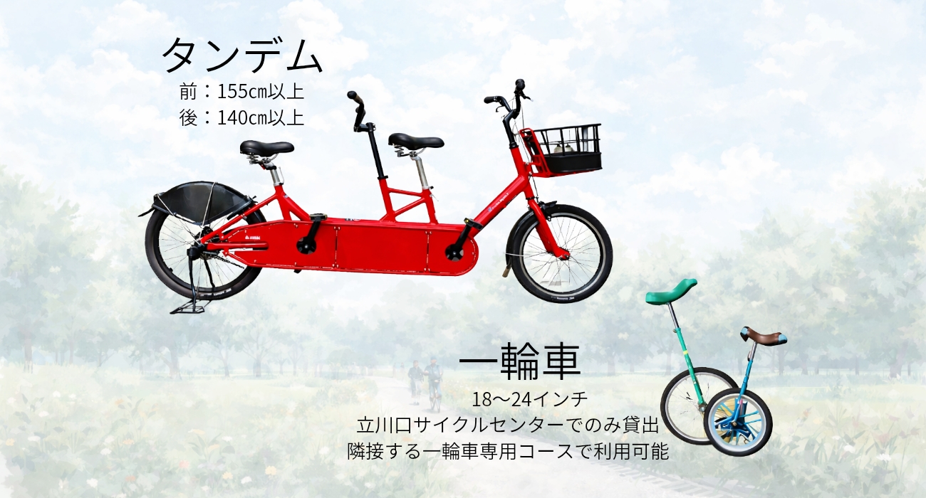 | タンデム(特殊自転車)/1台 | 3時間 1,500円(30分ごとに200円) |