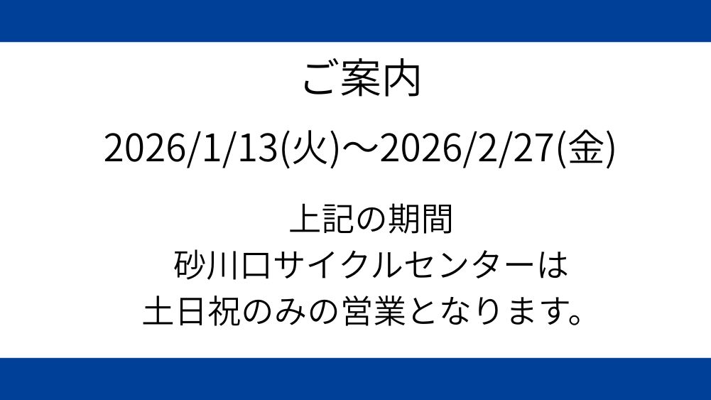 ・砂川口サイクルセンターは、1月13日(火)~2月27日(金)の期間、土・日・祝日のみ営業します(平日は休業)。