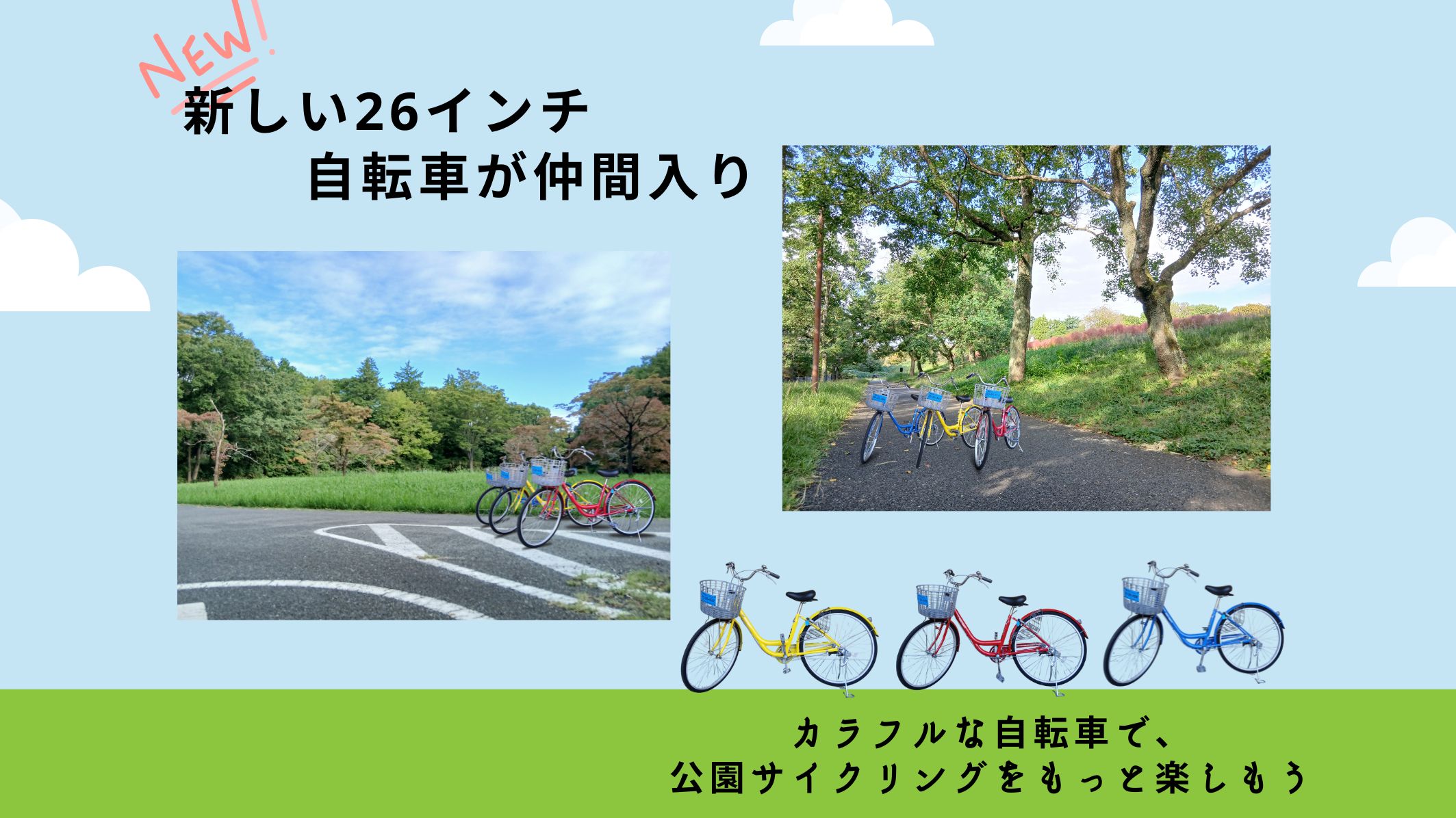 公園内には総延長14kmのサイクリングコースがあり、広い園内を移動するのにとても便利です。レンタサイクル(貸自転車)および持込みの自転車でご利用いただけます。自転車はサイクリングコース内を走行し、コース各所にある駐輪場にお停めください。