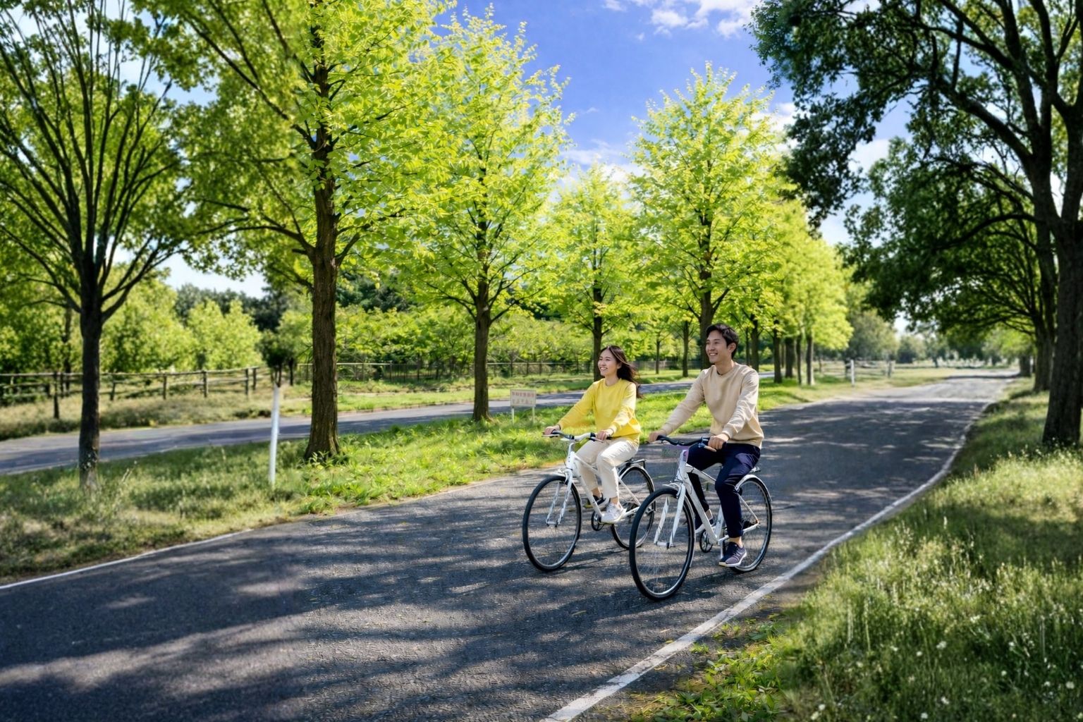 公園内には総延長14kmのサイクリングコースがあり、広い園内を移動するのにとても便利です。レンタサイクル(貸自転車)および持込みの自転車でご利用いただけます。自転車はサイクリングコース内を走行し、コース各所にある駐輪場にお停めください。