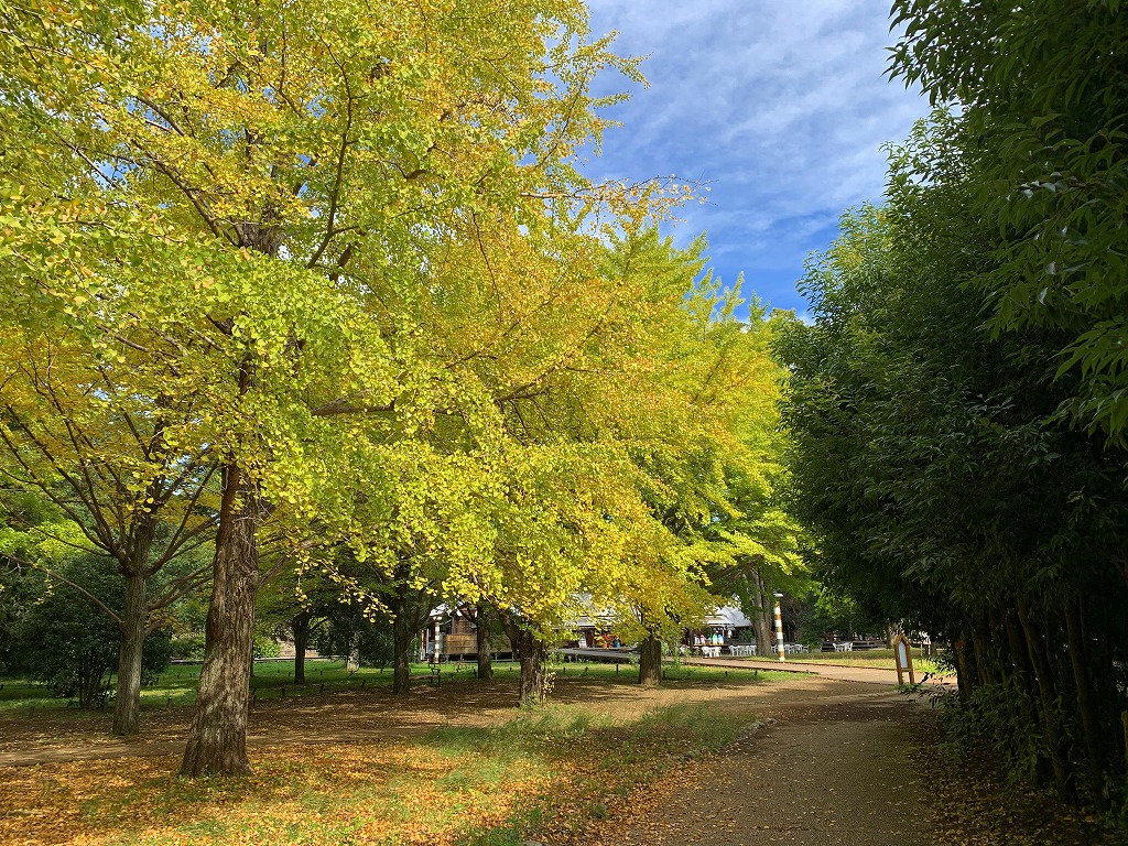 こどもの森やわんぱくゆうぐは色づき中、かたらいのイチョウ並木や立川口カナール並木は色づき前です。