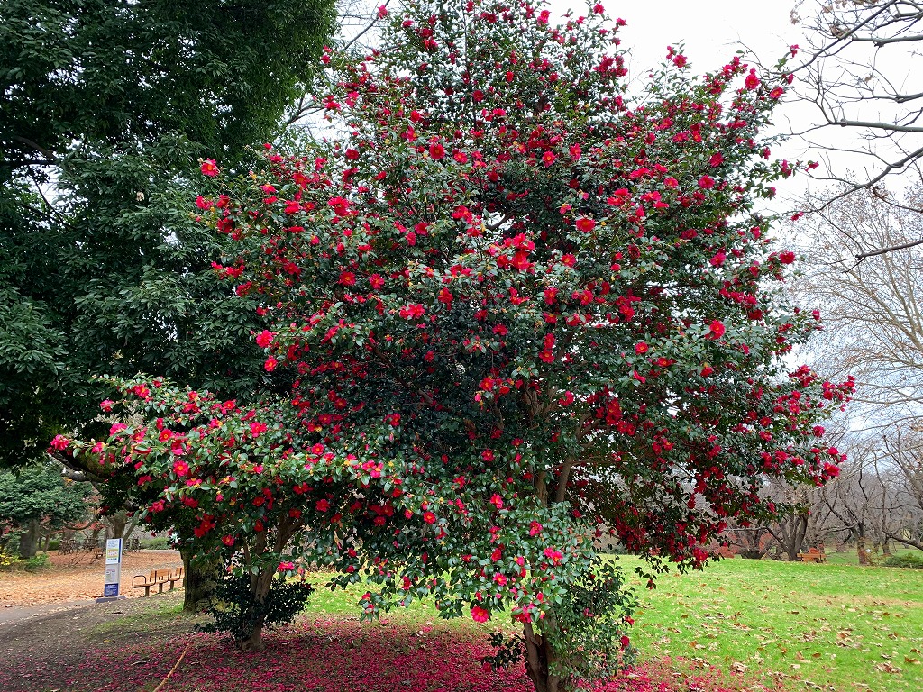 うんどう広場北側のサザンカはお花と落ちた花びらの絨毯のバランスが良くなっています。