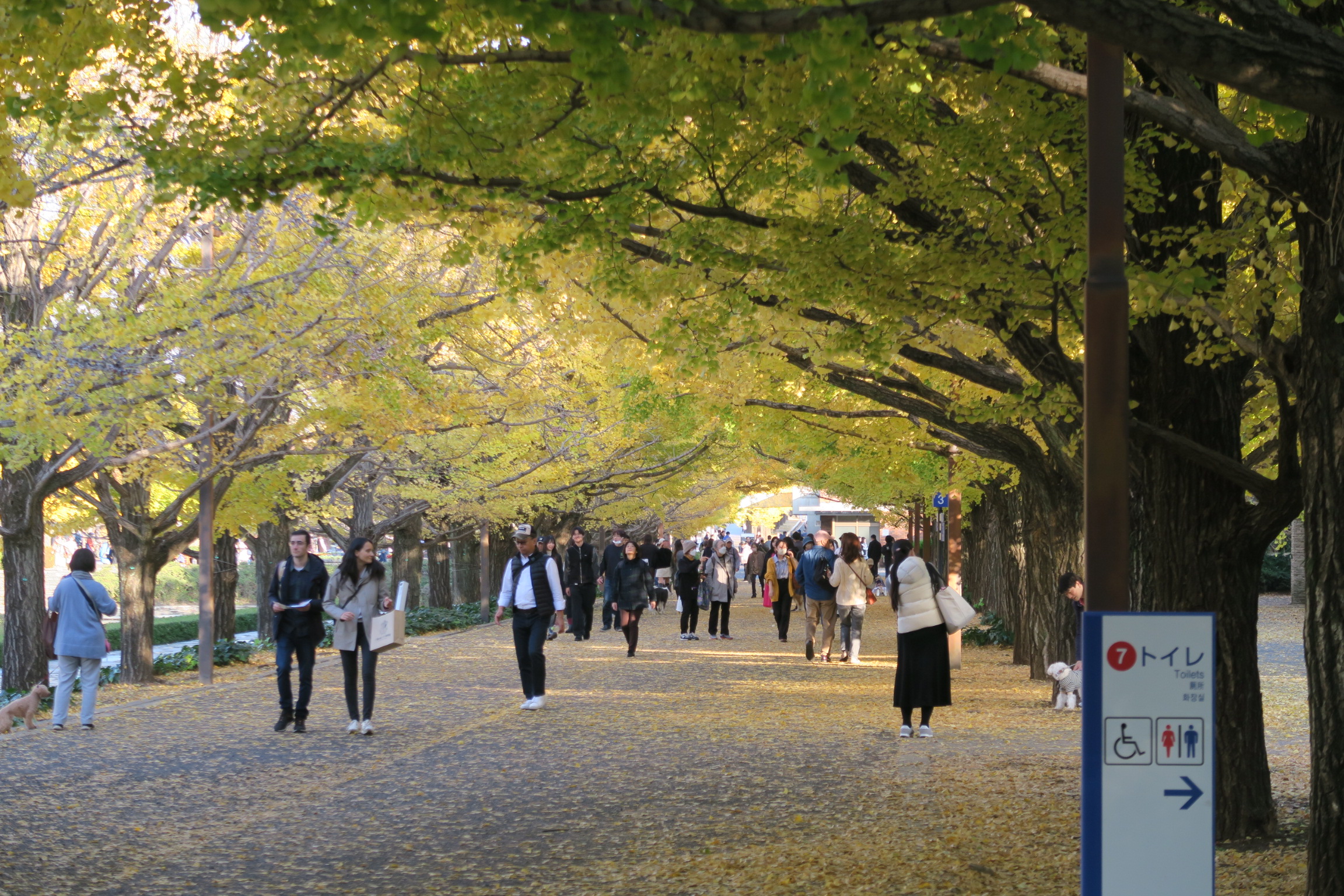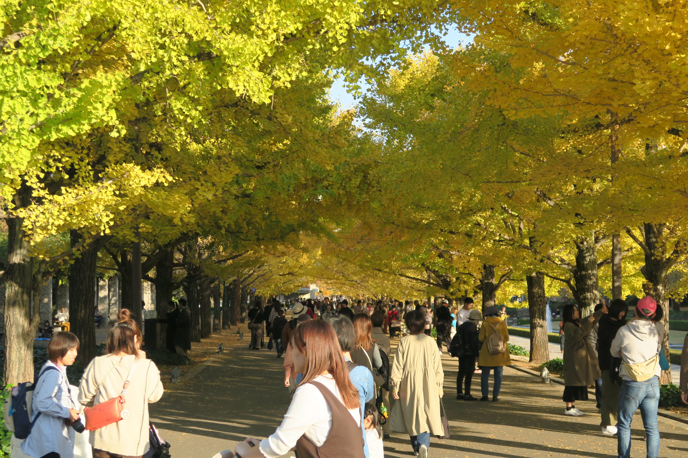 全長300mの園路に渡って植栽されたイチョウをお楽しみいただけます。真っすぐな並木ですが、地面に高低差があるため奥行きのある景観をご覧いただけます。