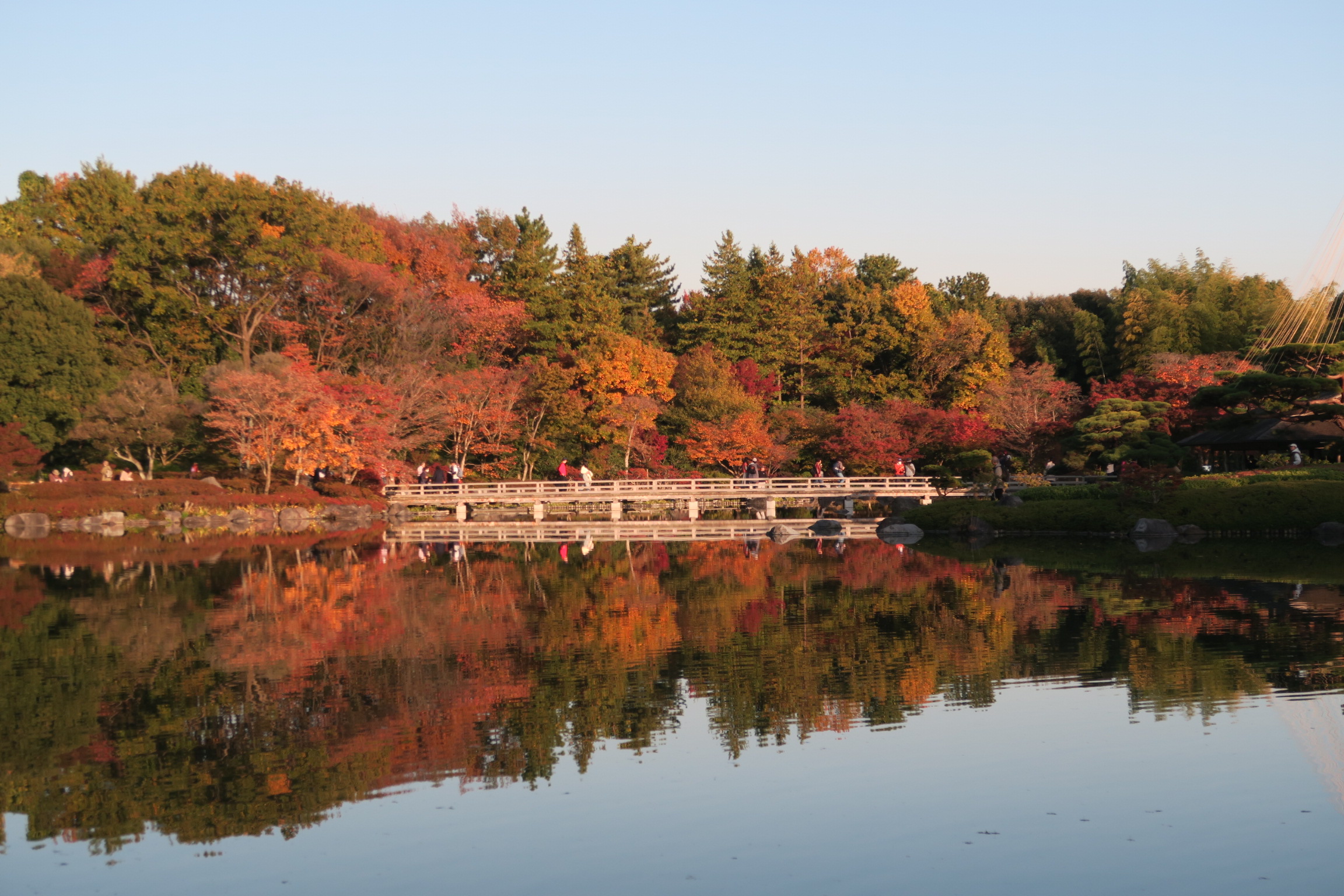日本庭園では、モミジ類の紅葉が見頃です。見頃の樹もありますが、青葉が目立つ樹もあるため、紅葉のグラデーションをご覧いただけます。中心に配した広大な池泉を巡り、刻々と移り行く景色をお楽しみください。