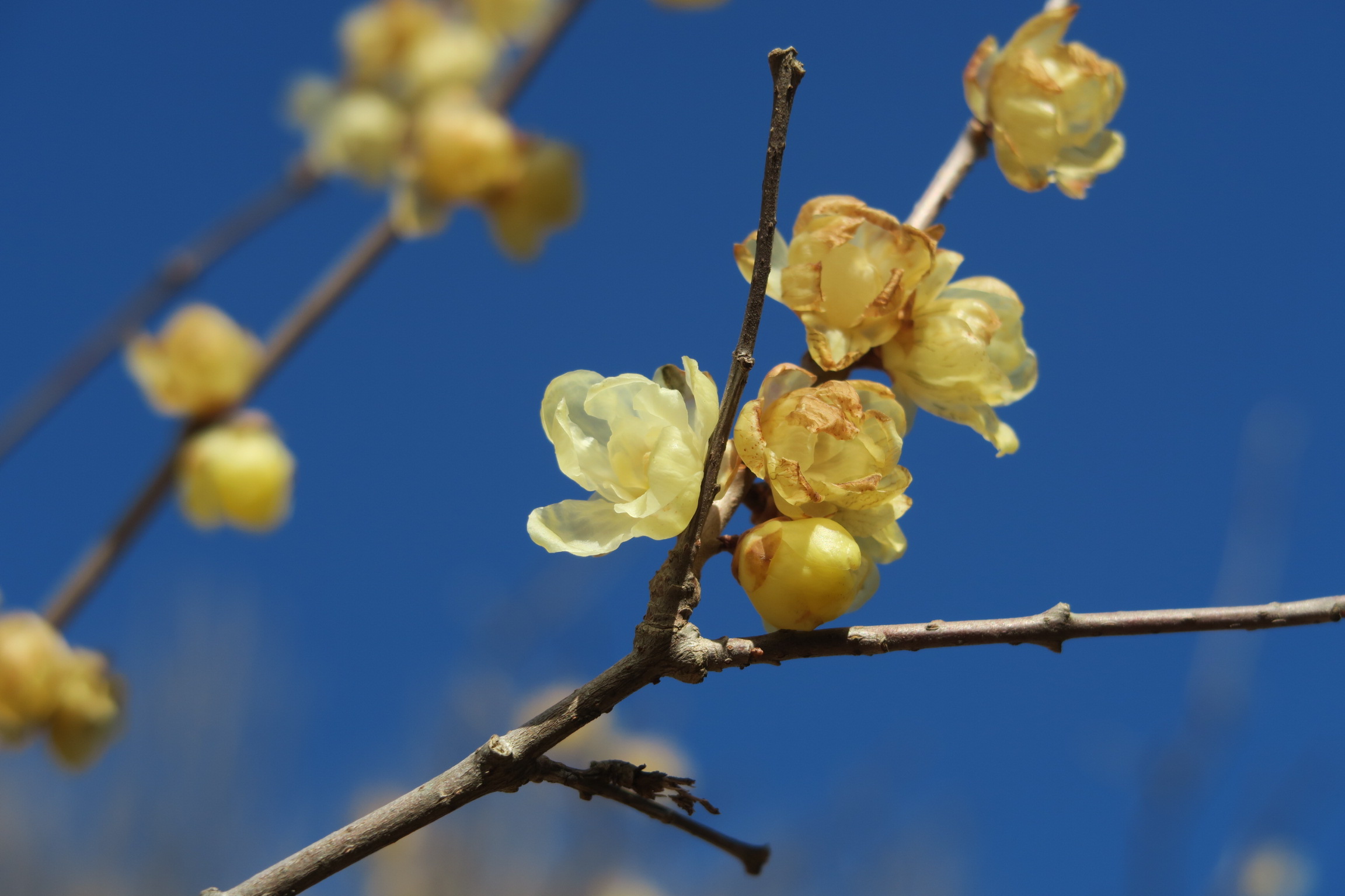 半透明で光沢のある蝋細工のような黄色い花を咲かせます。ロウバイとは異なり花の芯まで黄色いため、素心(そしん)ロウバイと呼ばれます。