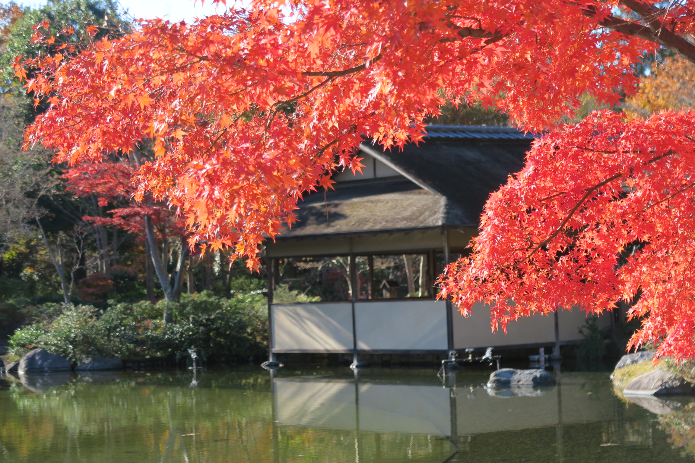 日本庭園内のカエデ類が全体的に見頃です。見頃は12月初旬まで続く予想です。