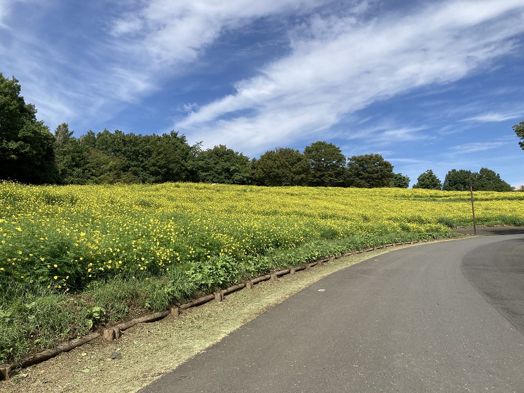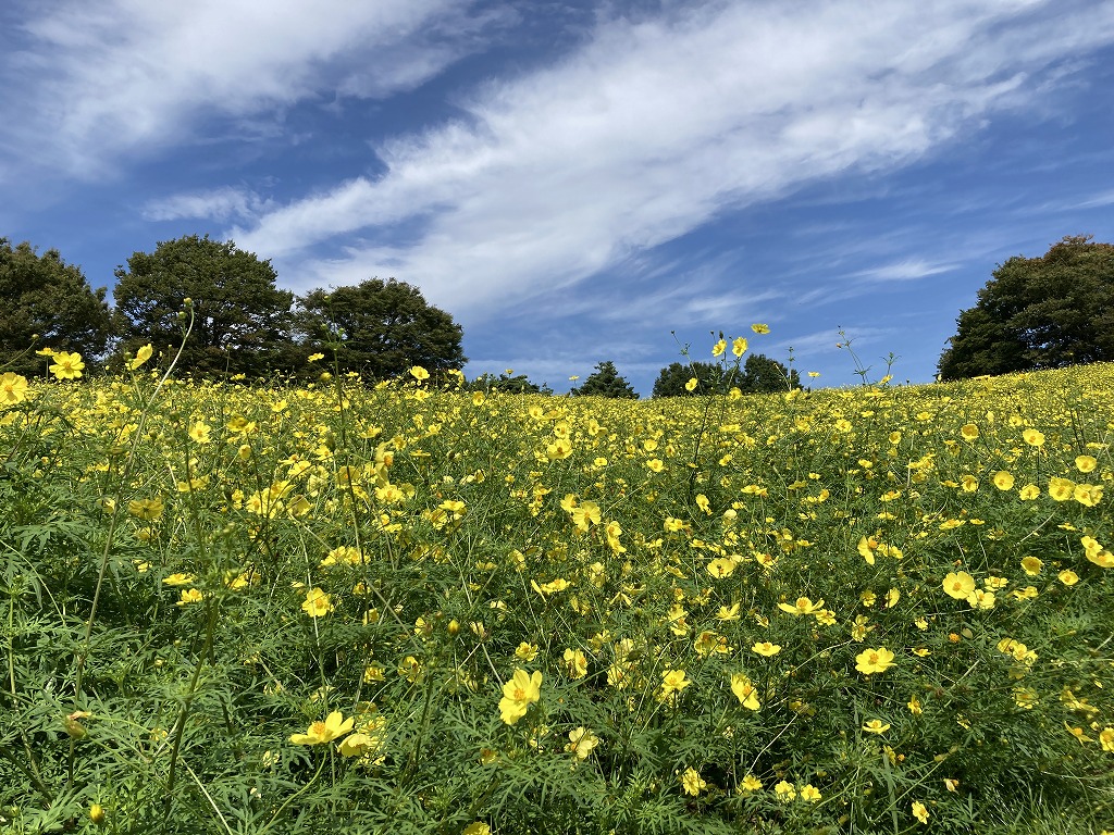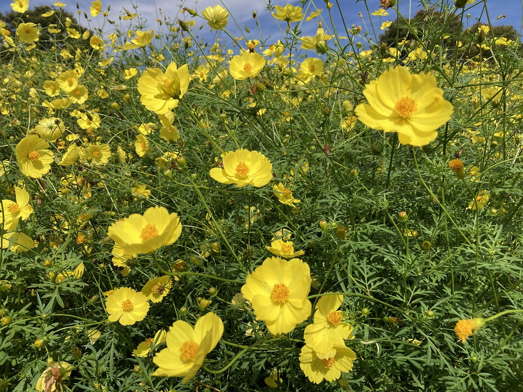 レモンブライトはキバナコスモスの品種の1つで、爽やかなレモンイエロー色の花を咲かせます。オレンジとのミックスのエリアもお楽しみいただけます。