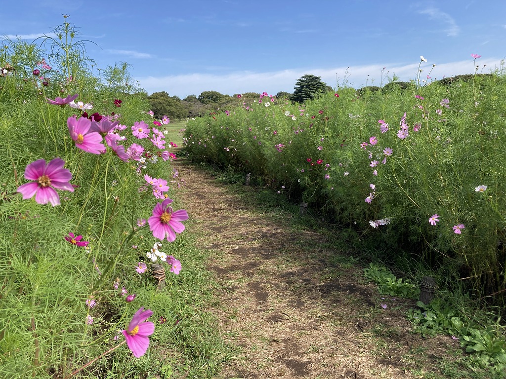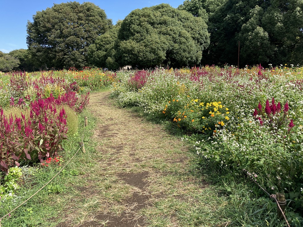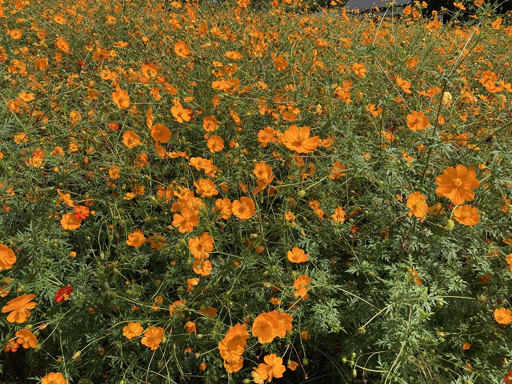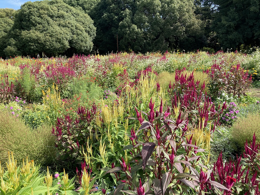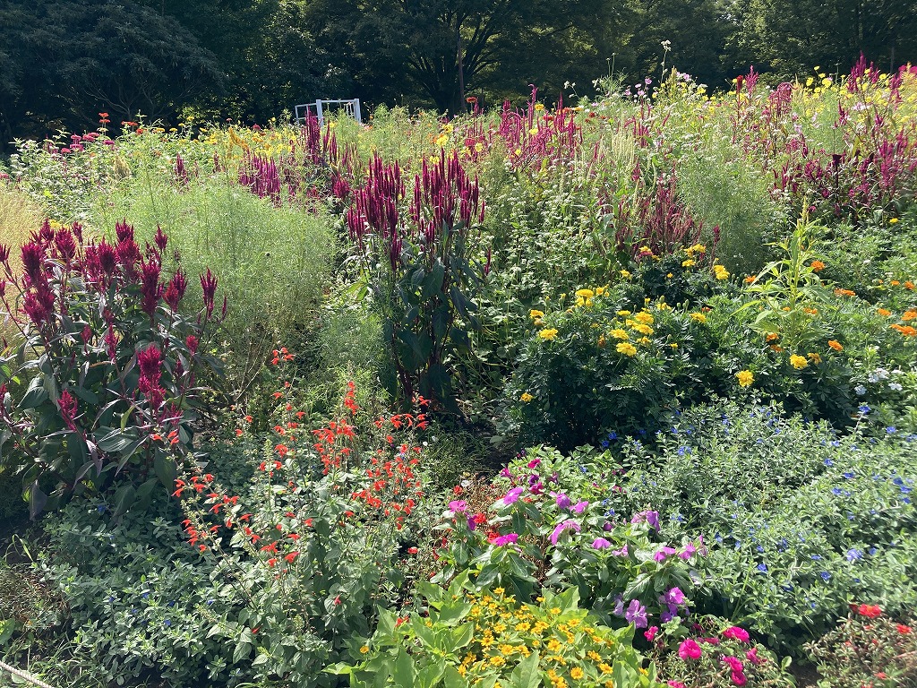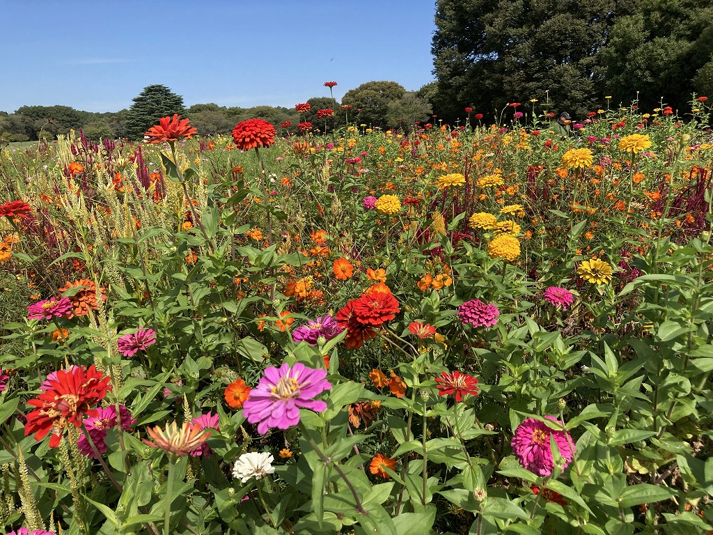約20品種の花が咲く花畑です。ジニア、ケイトウ、キバナコスモス、センセーション、ソバなどが咲きます。
