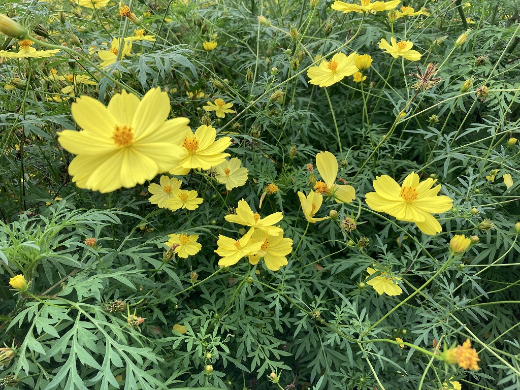 レモンブライトはキバナコスモスの品種の1つで、爽やかなレモンイエロー色の花を咲かせます。オレンジとのミックスのエリアもお楽しみいただけます。