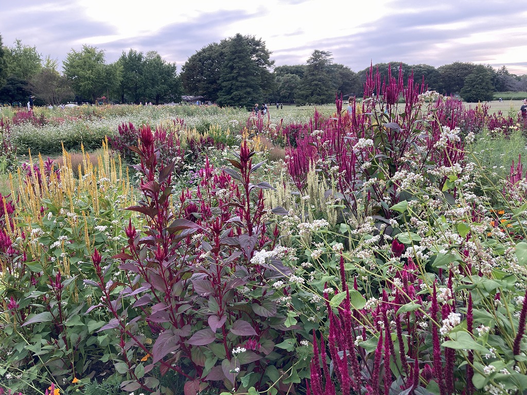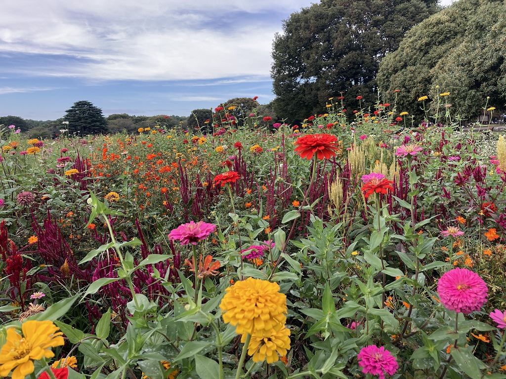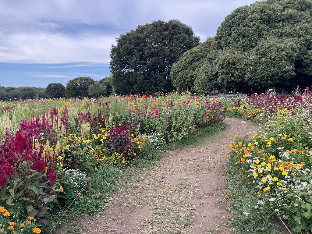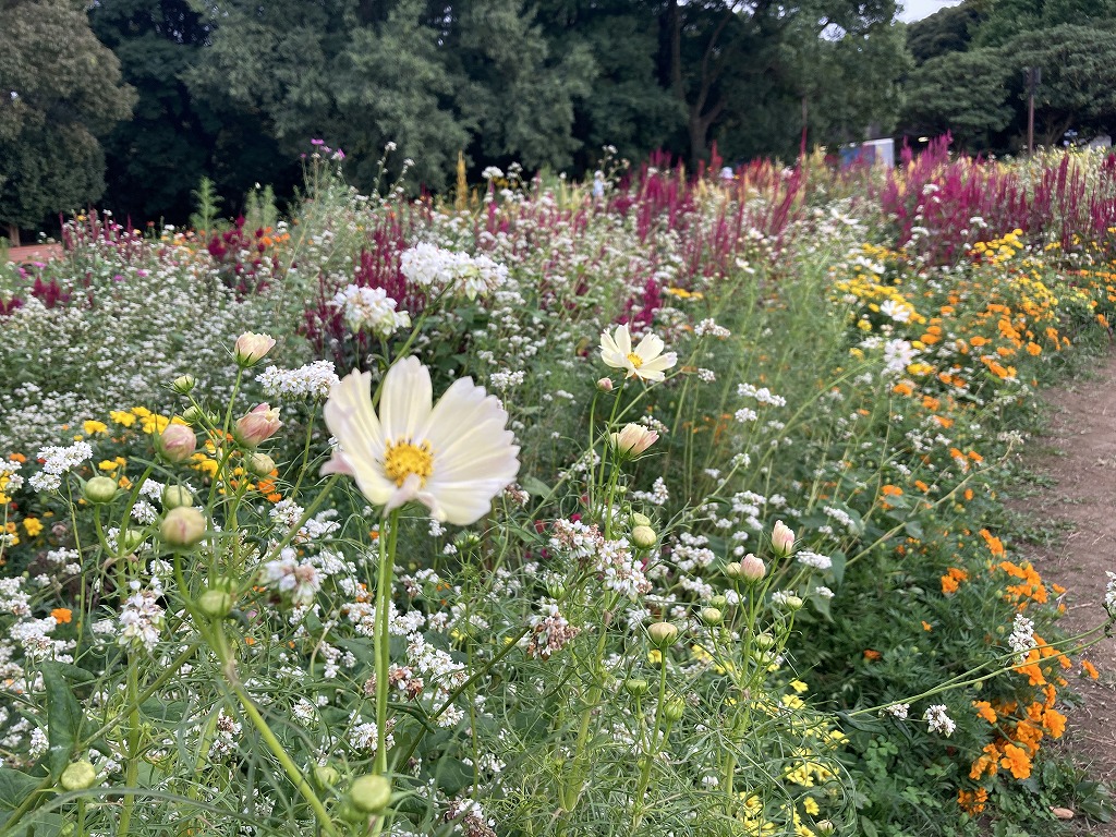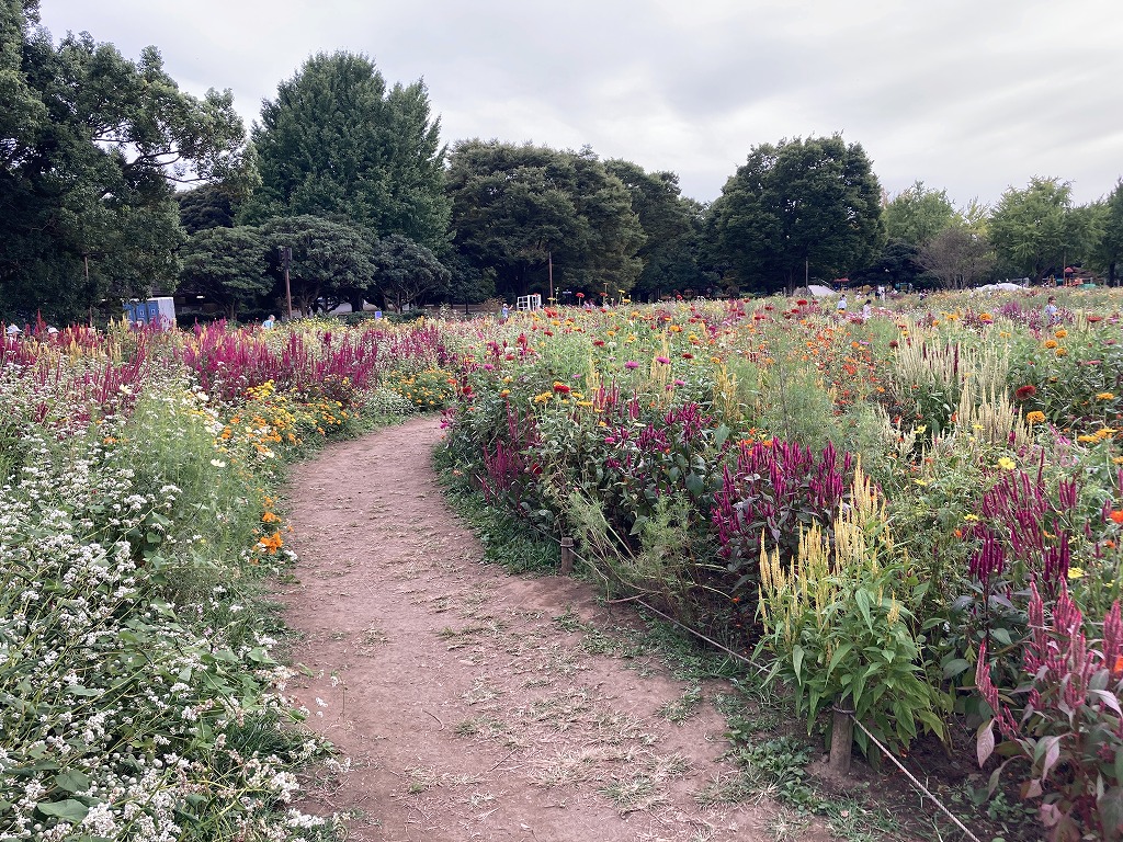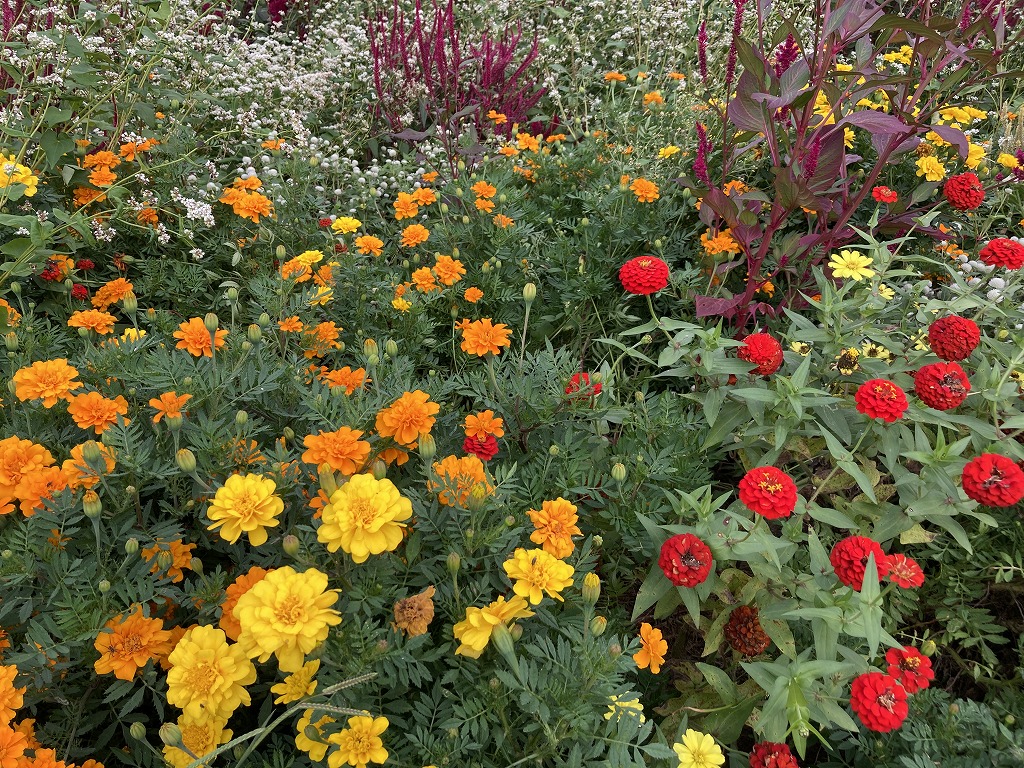 約20品種の花が咲く花畑です。ジニア、ケイトウ、キバナコスモス、センセーション、ソバなどが咲きます。