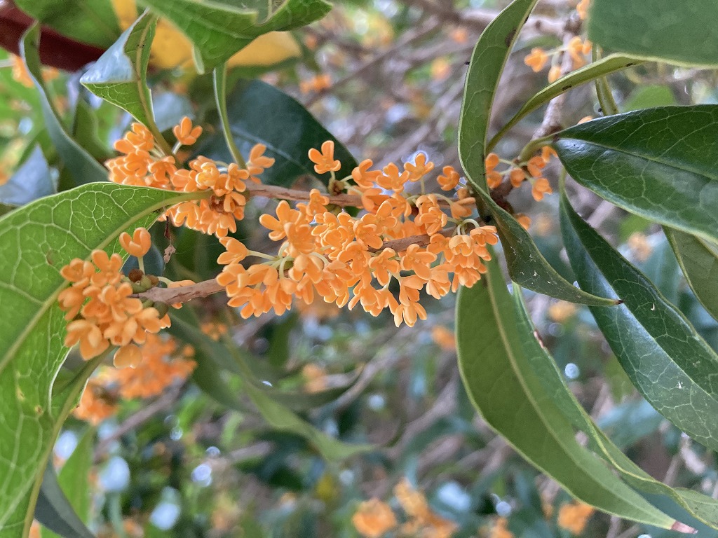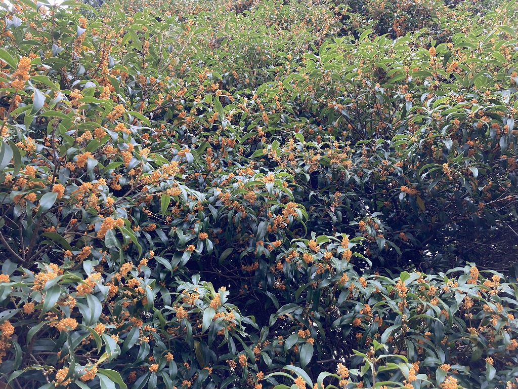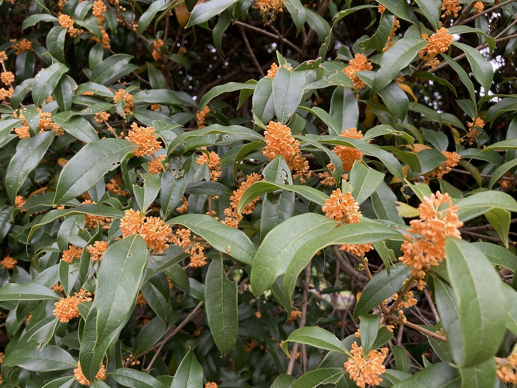 橙黄色の小さな花をたくさん付け、独特の甘い香りがします。