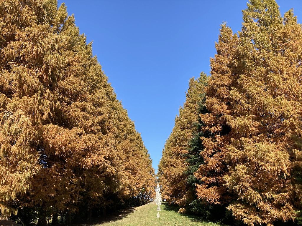 セコイアと言う常緑種によく似ていることから、変わったセコイアと言う意味のメタセコイアから付いた名前です。紅葉シーズンでは終盤に色付いてくる樹木です。
