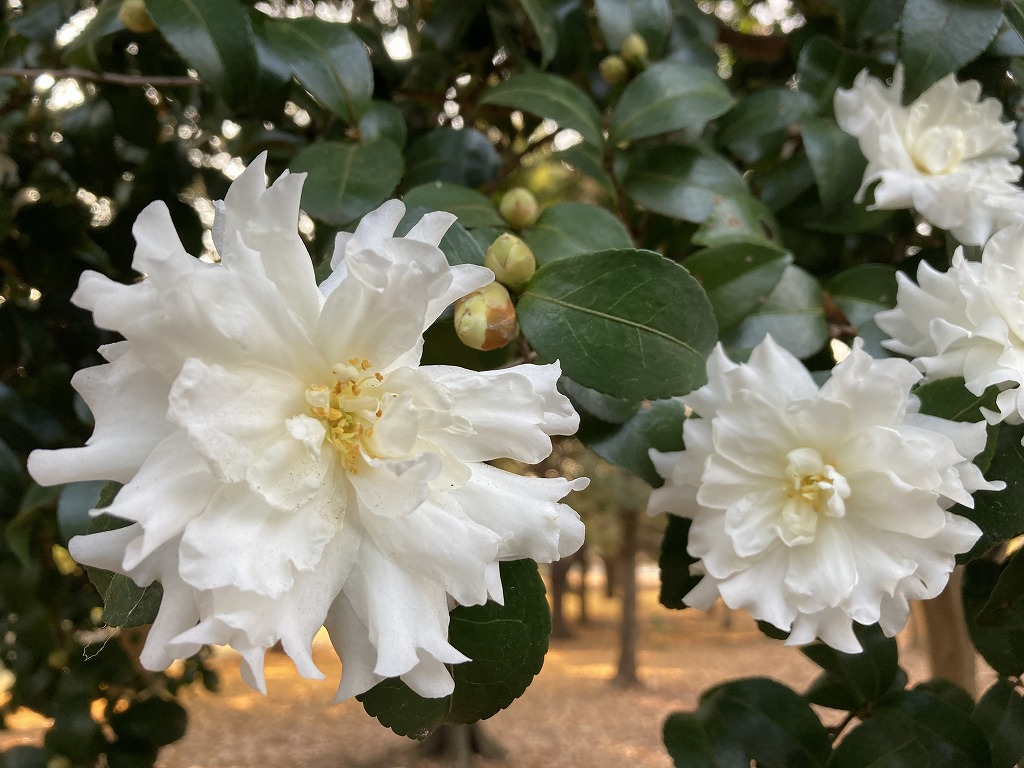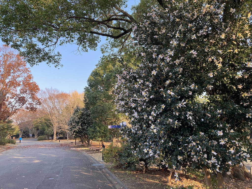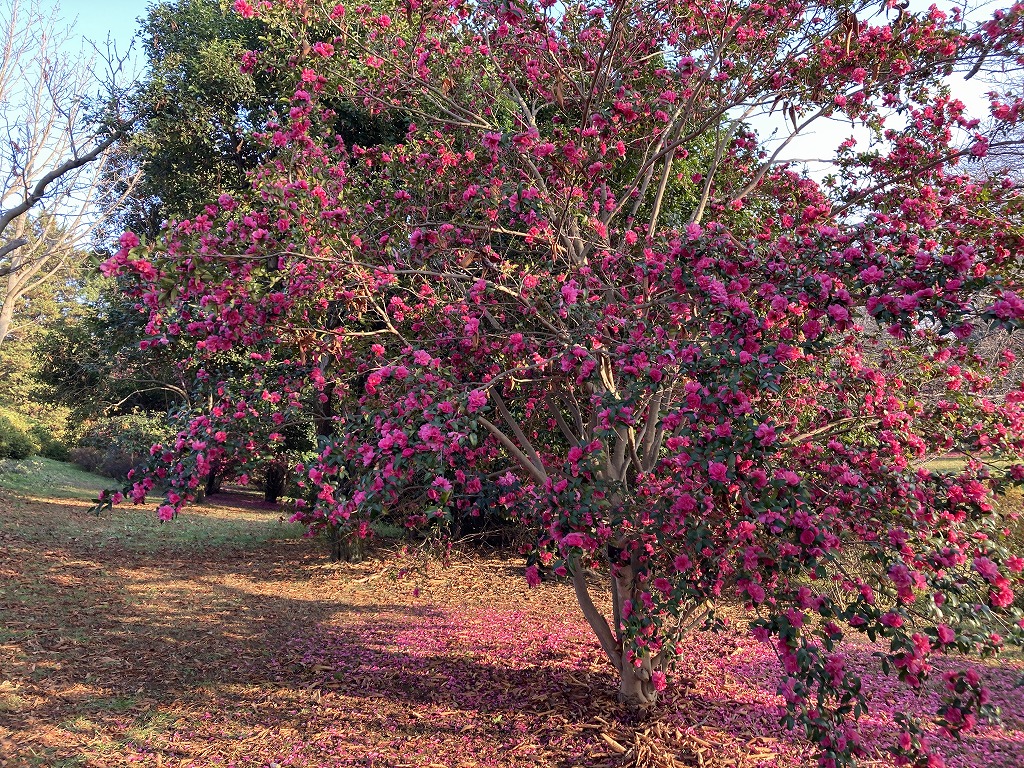 基本的な性質はツバキと似ていますが、ツバキより早く、晩秋から咲きます。また、花が終わると1輪丸ごと落とすツバキに対し、サザンカは花びらが1枚ずつバラバラに散ります。