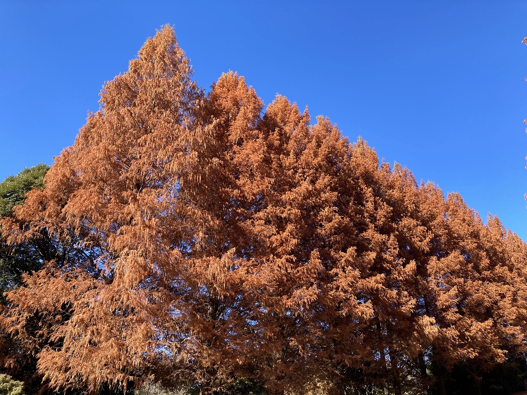セコイアと言う常緑種によく似ていることから、変わったセコイアと言う意味のメタセコイアから付いた名前です。朝日や夕日があたると葉がオレンジ色に見えてきれいです。