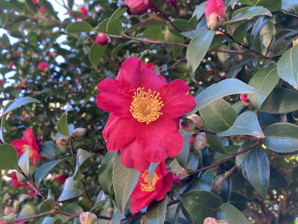 基本的な性質はツバキと似ていますが、ツバキより早く、晩秋から咲きます。また、花が終わると1輪丸ごと落とすツバキに対し、サザンカは花びらが1枚ずつバラバラに散ります。