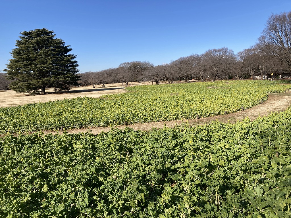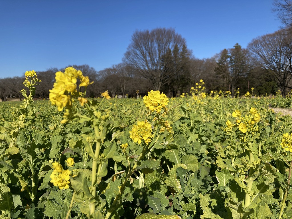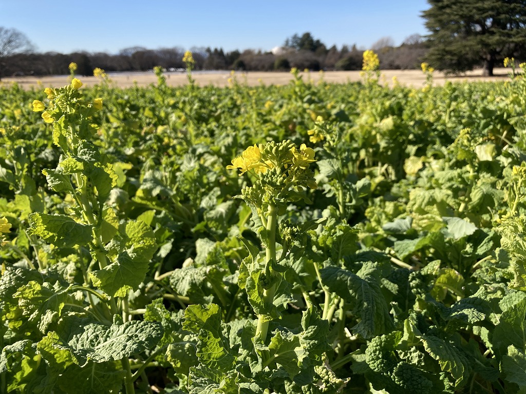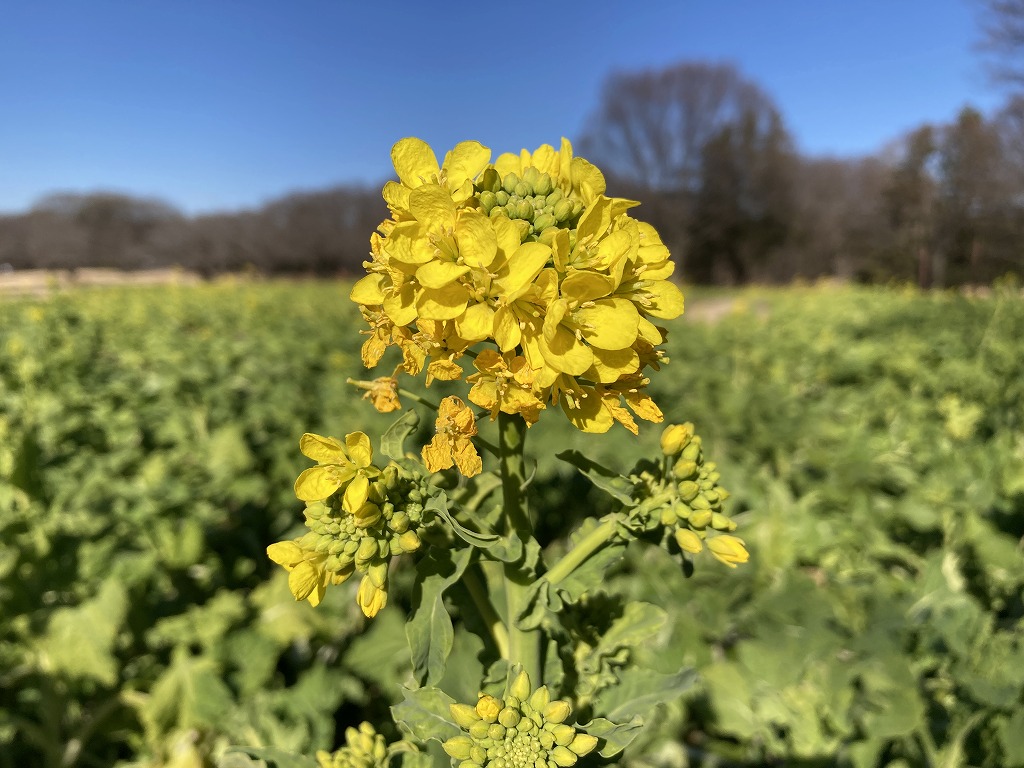 群生したナノハナは春になると一面黄色の景色を作ります。葉は食用になる他、種から取れる油は菜種油として利用されます。