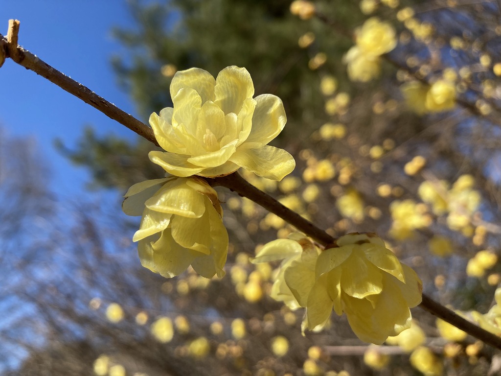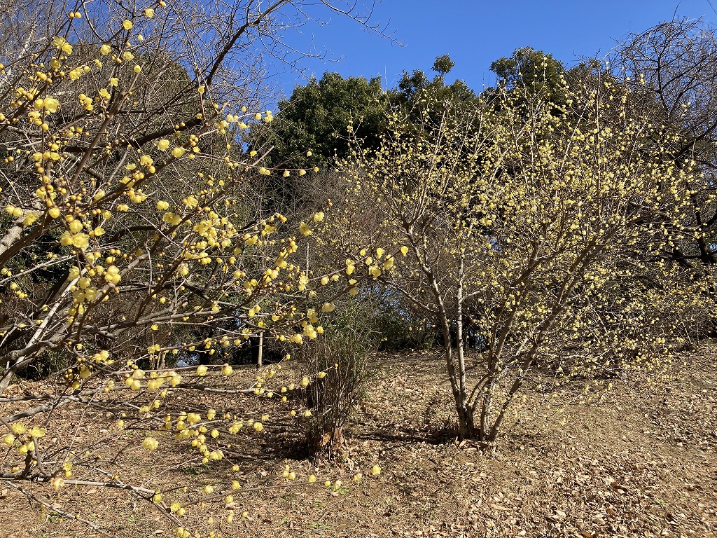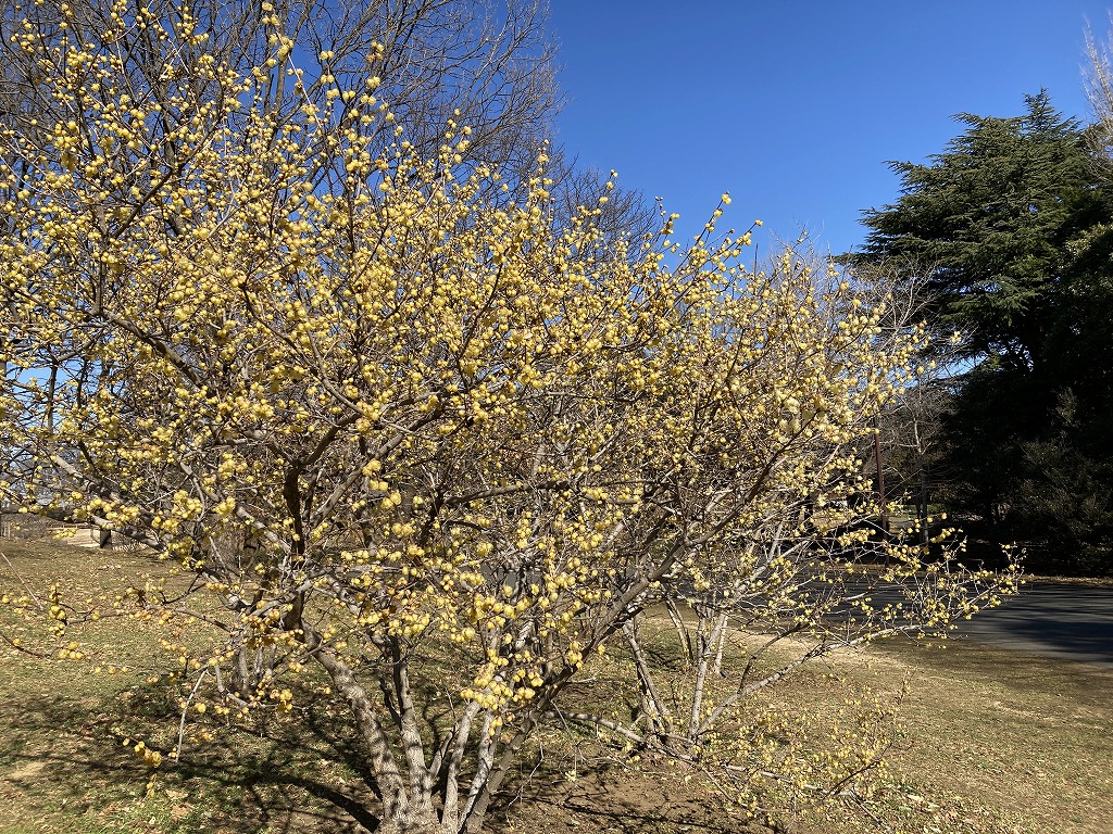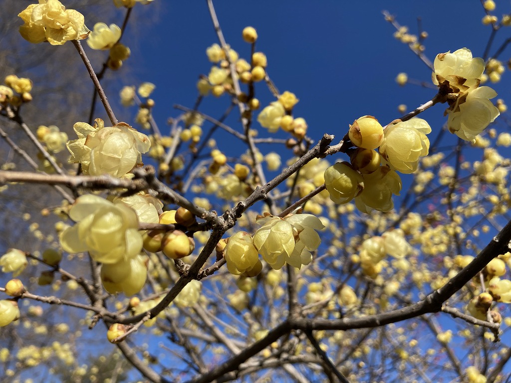 半透明で光沢のある蝋細工のような黄色い花を咲かせます。ロウバイとは異なり花の芯まで黄色いため、素心(そしん)ロウバイと呼ばれます。
