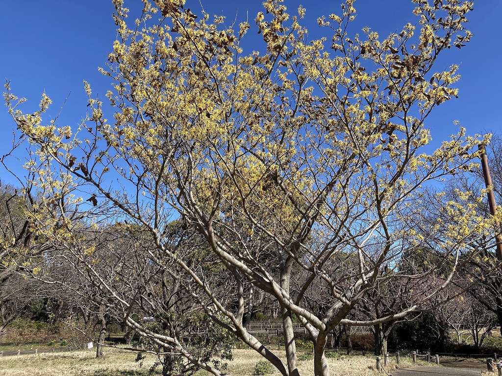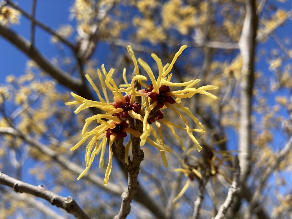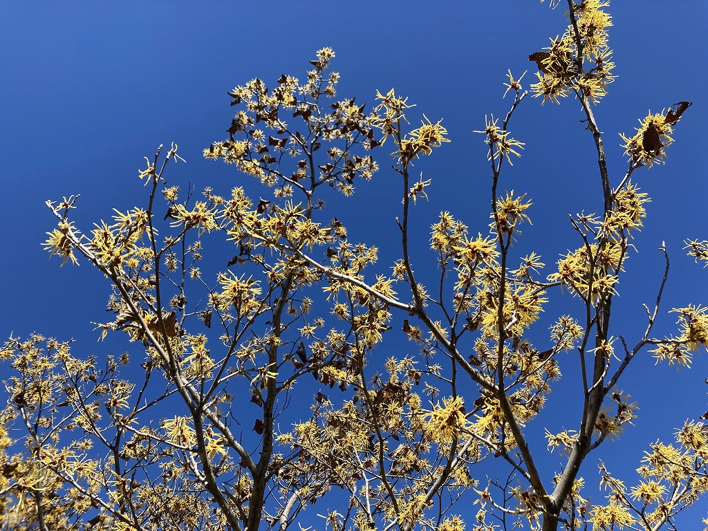 黄色いリボン状の花が咲きます。マンサクより花や葉が大きく、枯葉が残るのが特徴です。