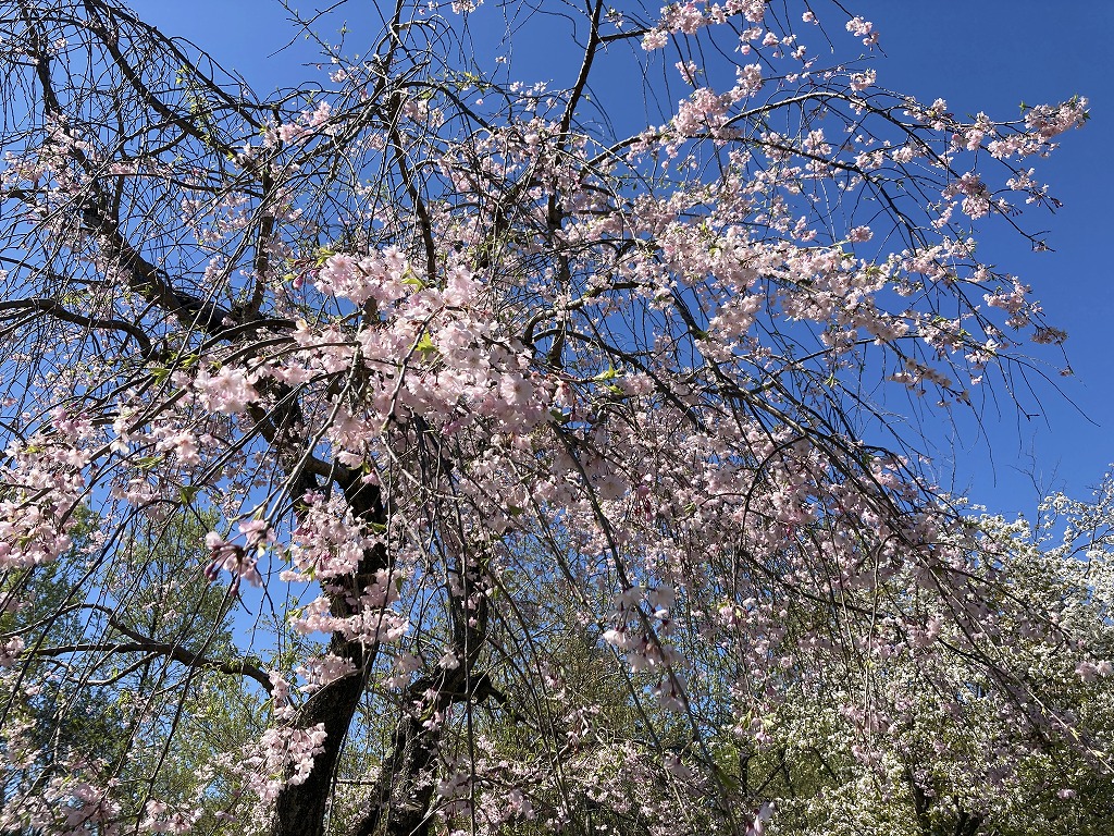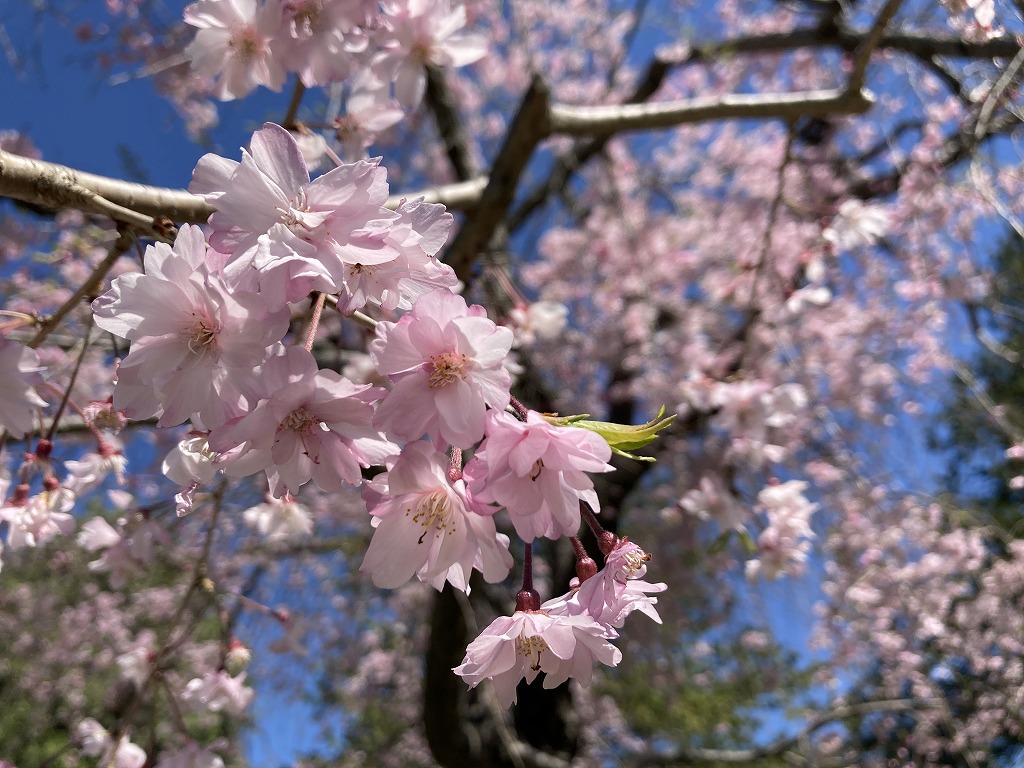 江戸時代から栽培されていて、濃紅色の小輪で八重咲の花を枝いっぱいにつける枝垂桜です。