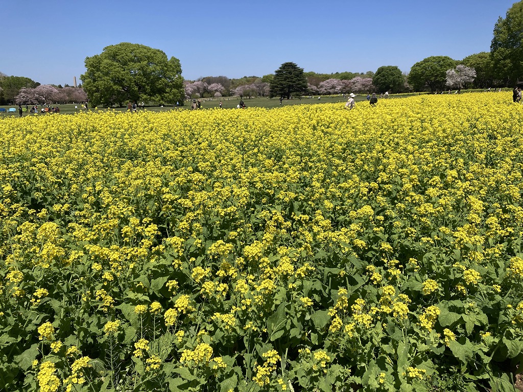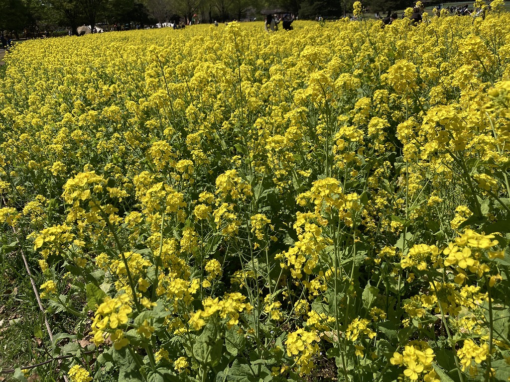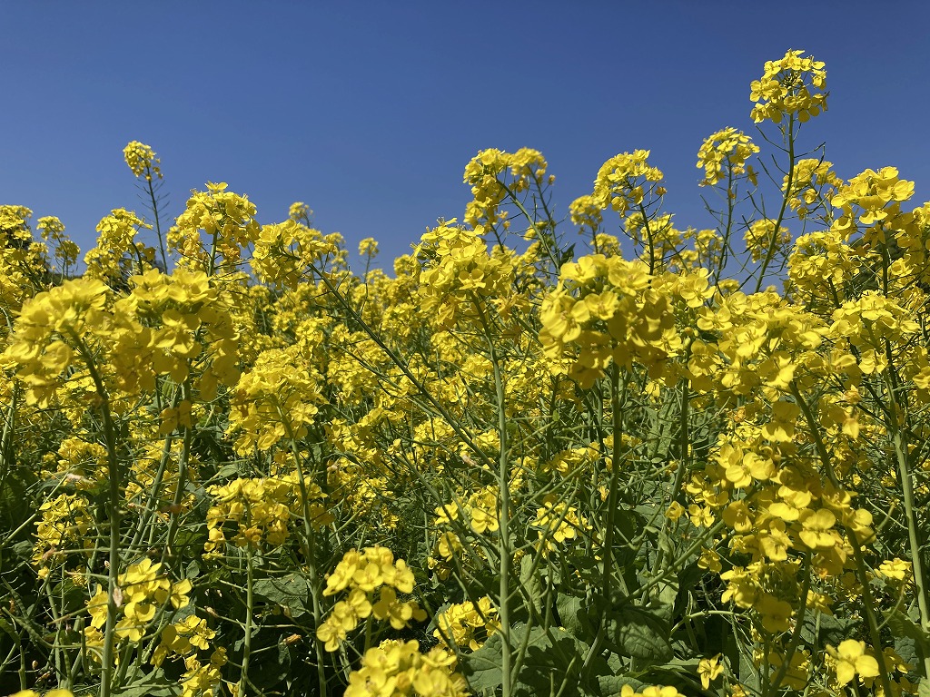 群生したナノハナは春になると一面黄色の景色を作ります。葉は食用になる他、種から取れる油は菜種油として利用されます。