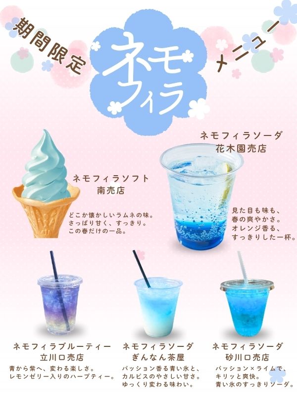 フードショップ/ネモフィラメニュー販売中 2026/04/17 お知らせ 園内では、ネモフィラをテーマにした期間限定メニューを販売しています。 ネモフィラを思わせるさわやかなブルーカラーのメニューをご用意しております。 園内散策のおともに、季節ならではの味わいをぜひお楽しみください。 一覧へ戻る