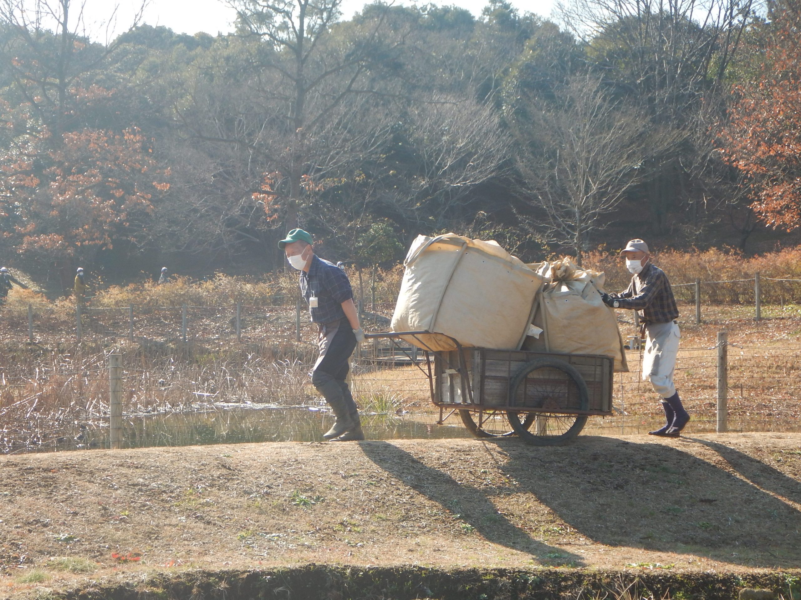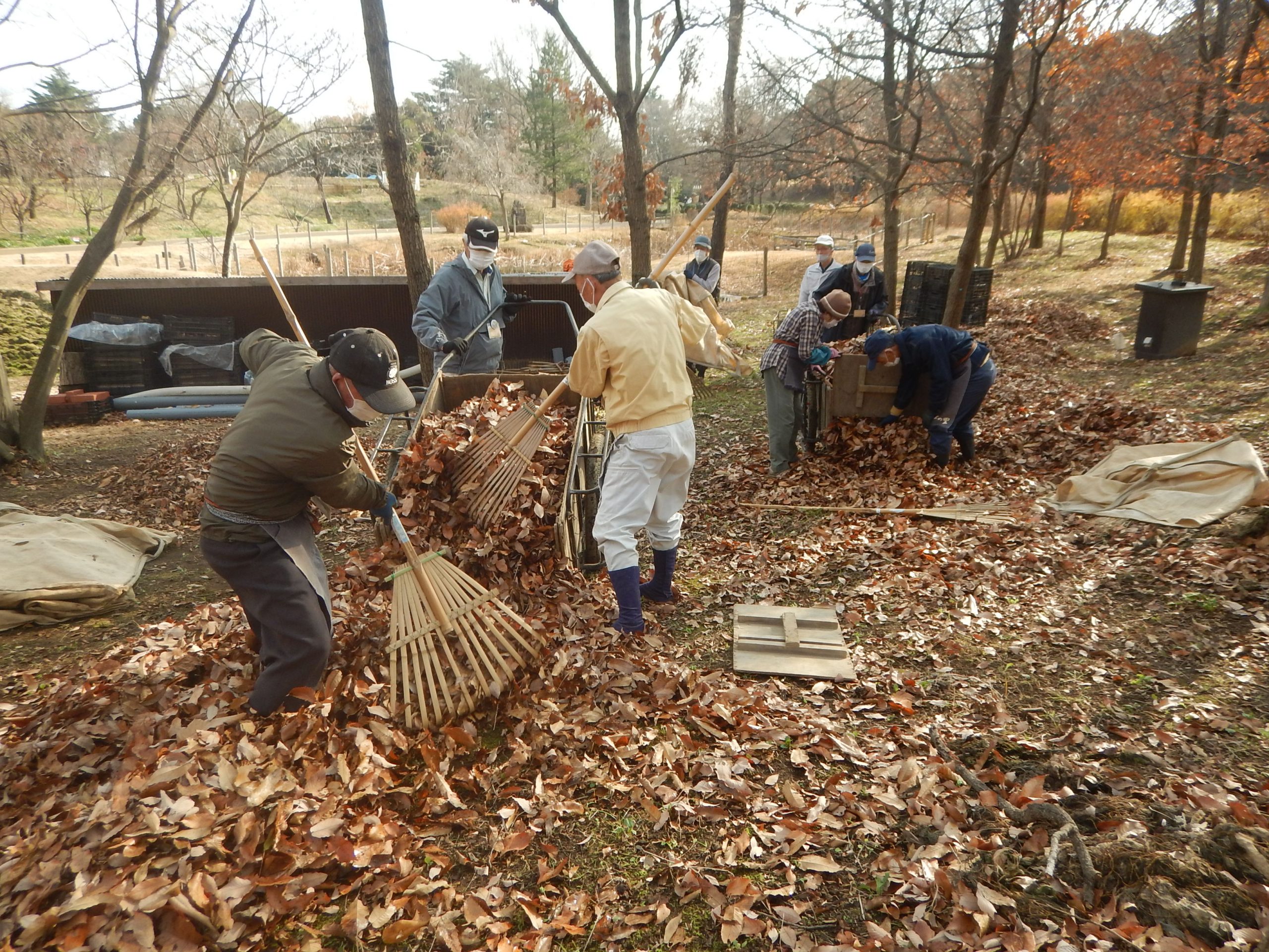 水田周りの落葉を集め、堆肥置き場に運びました。