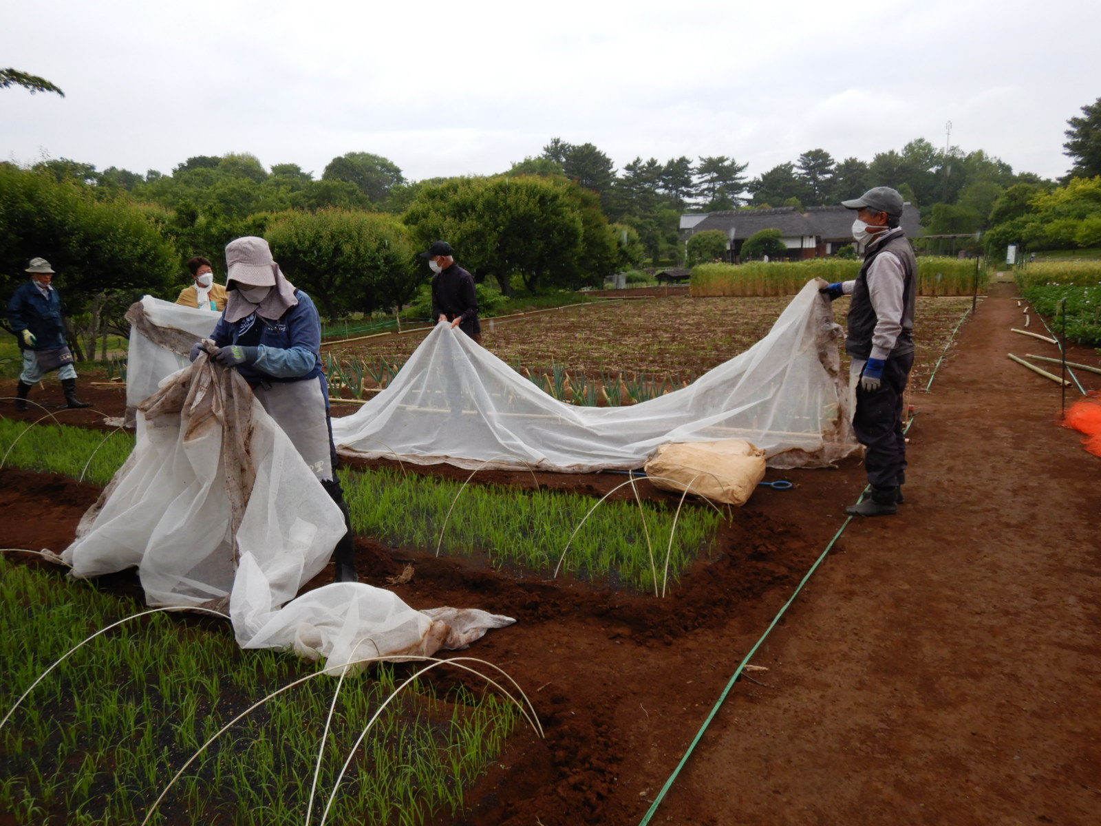 苗代の寒冷紗を外し、鳥よけのネットを掛けました。