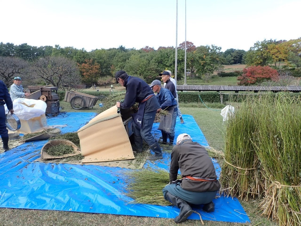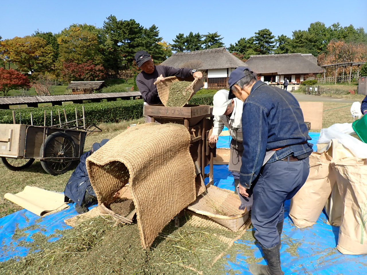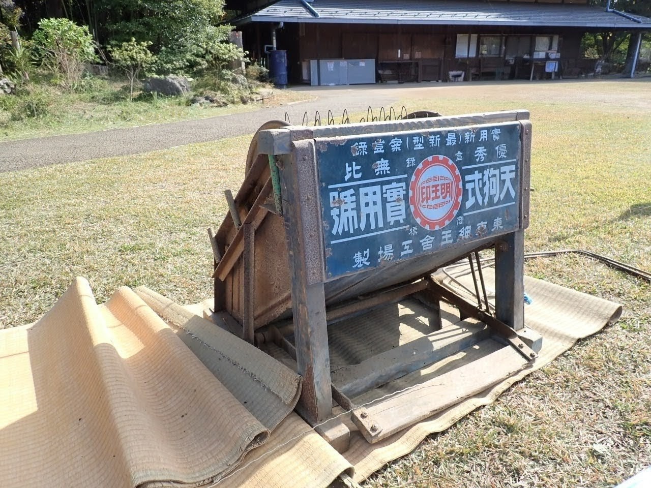 足踏み脱穀機でそばの脱穀をし、唐箕(とうみ)がけをして実を選別しました。